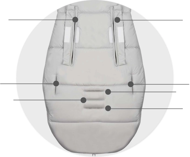 Ouverture par le haut et par le bas pour l’aération et un accès facile. La chancelière peut être entièrement ouverte et utilisée comme assise/liner de poussette – une flexibilité maximale tout au long de la saison.