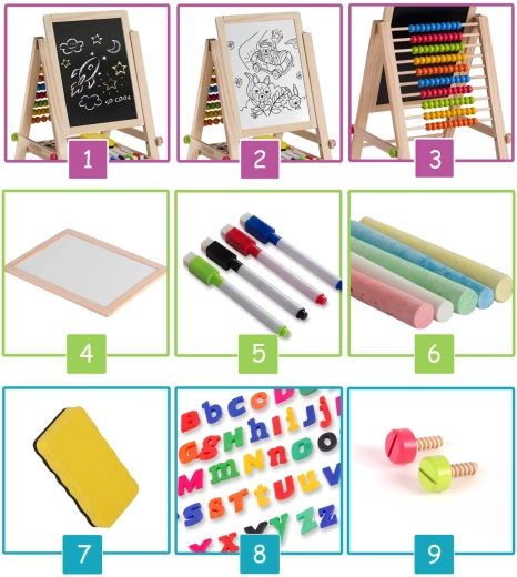 Il comprend un boulier pratique pour s’exercer de façon ludique aux nombres et aux opérations simples, une tablette amovible pour une utilisation hors du support et un équipement complet : craies colorées, marqueurs effaçables à sec, éponge et lettres et chiffres magnétiques. Le tableau se plie rapidement sans outils et se transporte facilement.