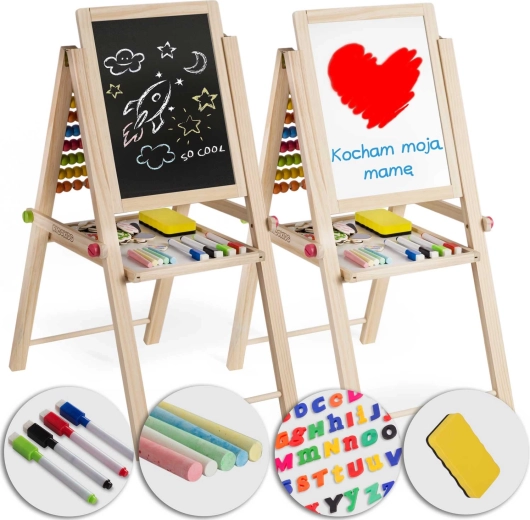 Le tableau double face offre un côté classique à craie pour dessiner et un côté magnétique effaçable à sec pour écrire au feutre et jouer avec des aimants. Idéal pour la créativité et l’apprentissage des lettres et des chiffres.
