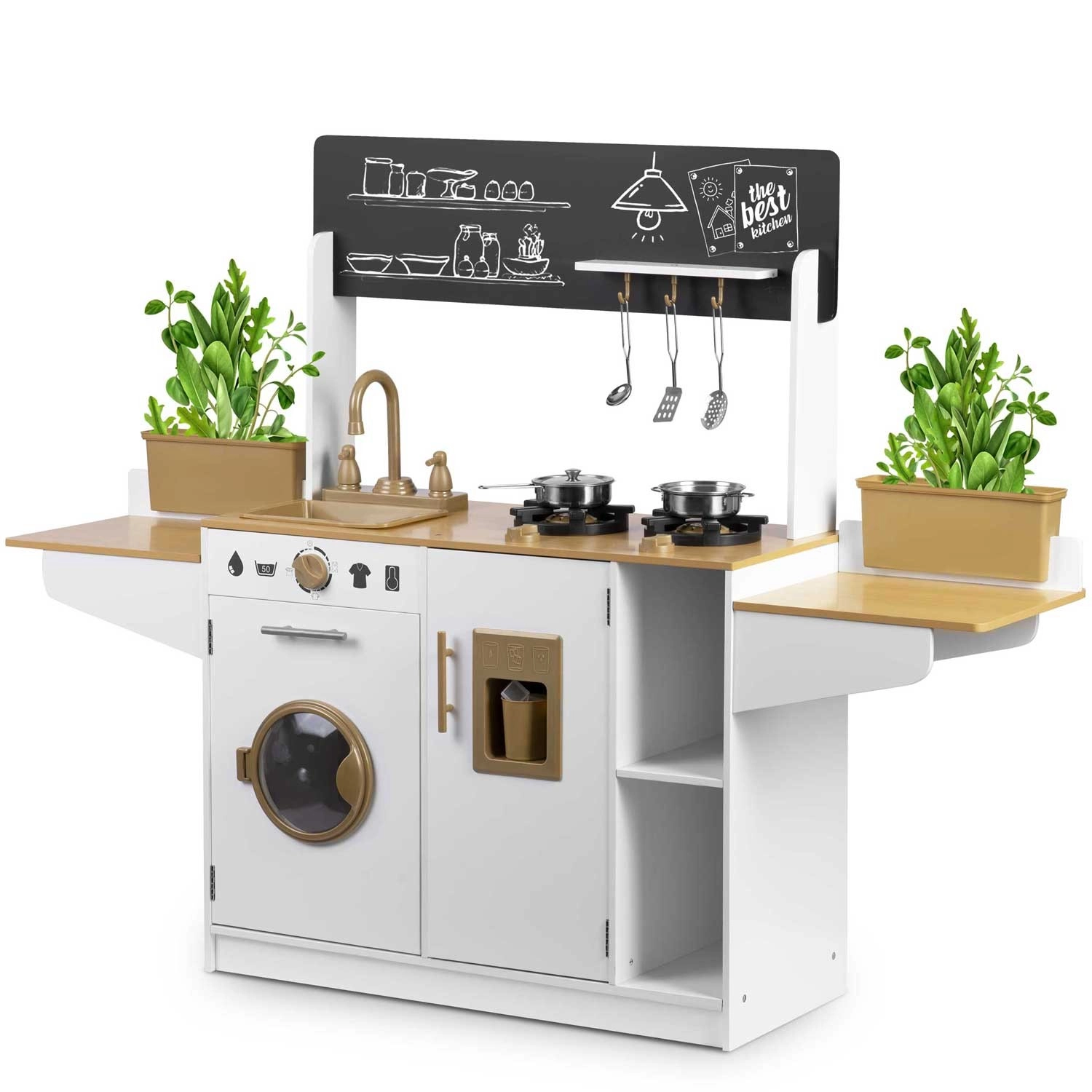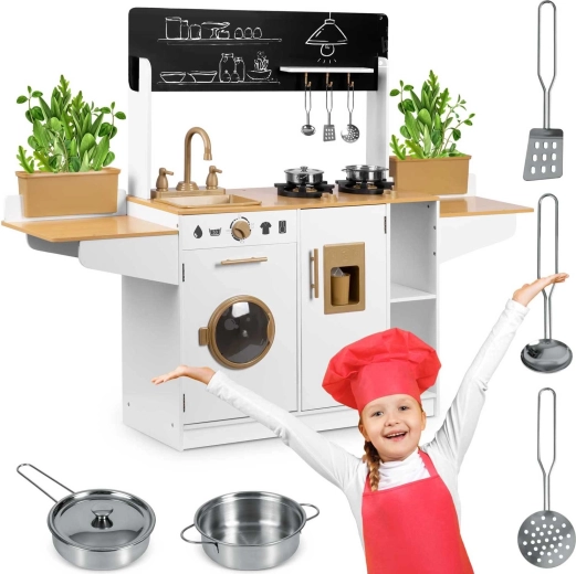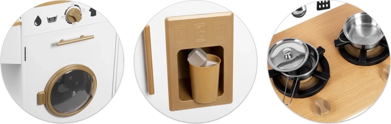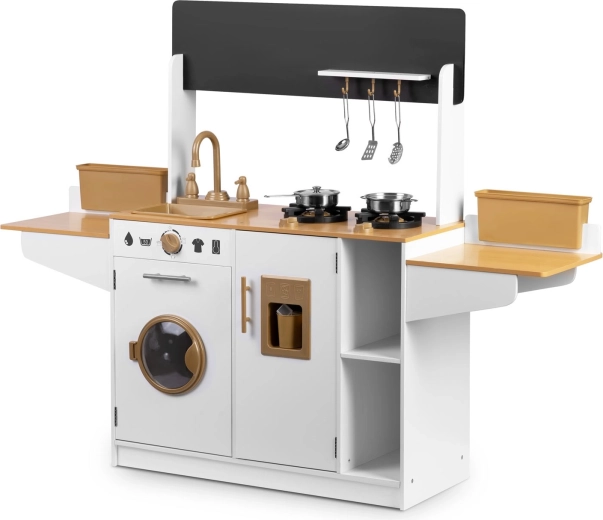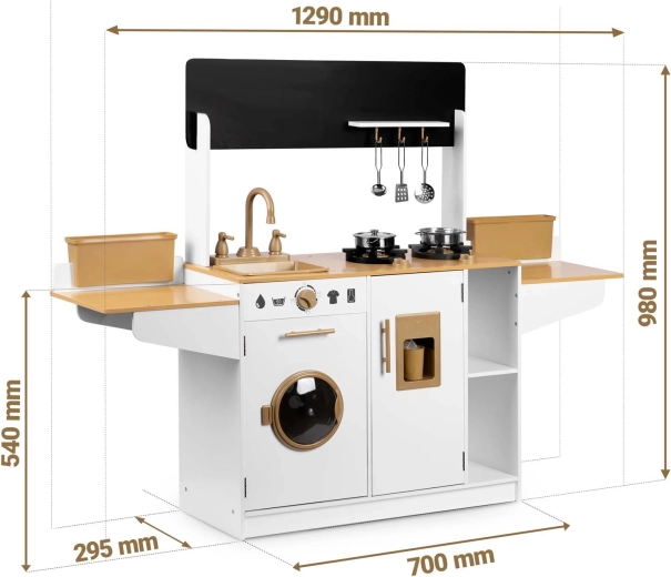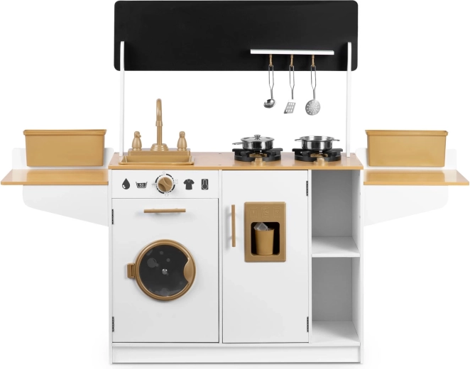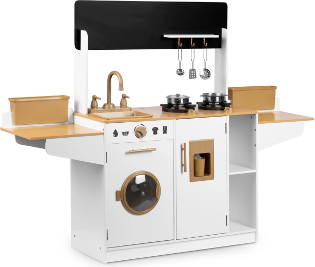 La cuisine en bois pour enfants RICOKIDS apporte des détails réalistes qui raviront les petits cuisiniers et cuisinières : boutons fonctionnels, évier avec robinets, portes ouvrantes et « appareils » comme une machine à laver ou un réfrigérateur avec distributeur de glaçons. Un ensemble de vaisselle métallique et des ustensiles de cuisine à suspendre sont également inclus.