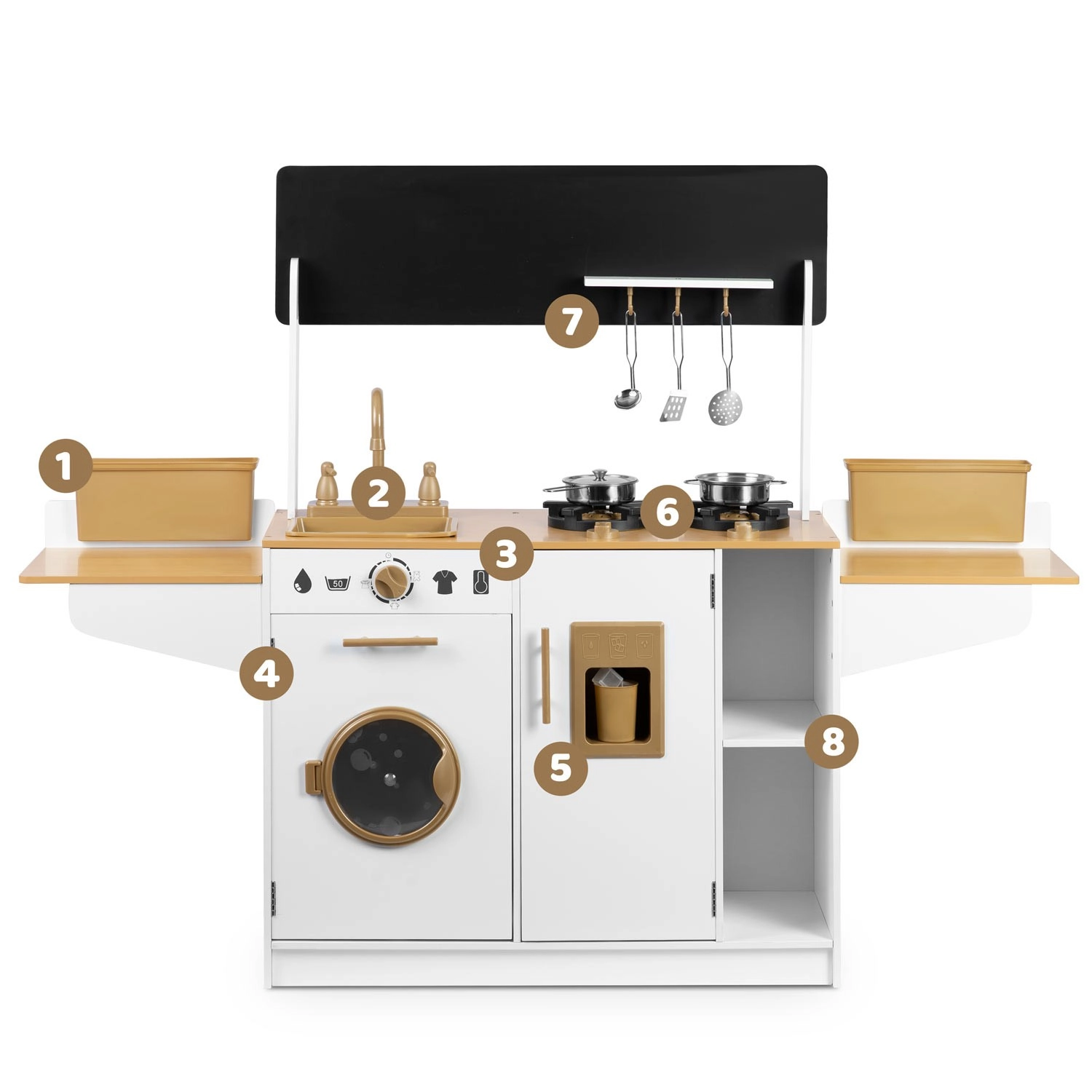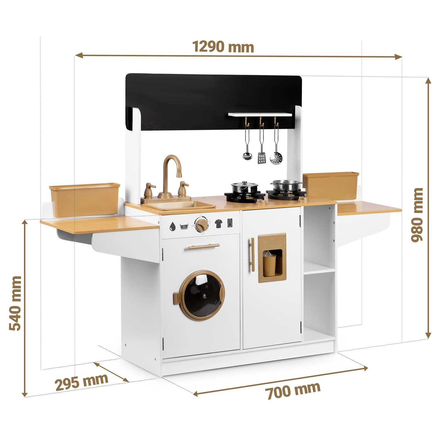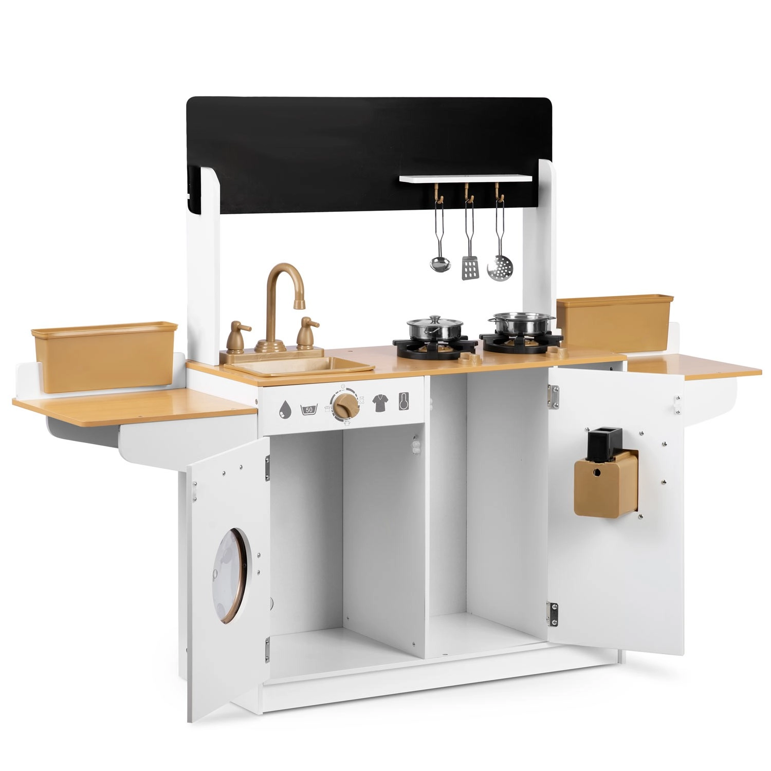 La cuisine en bois pour enfants RICOKIDS apporte des détails réalistes qui raviront les petits cuisiniers et cuisinières : boutons fonctionnels, évier avec robinets, portes ouvrantes et « appareils » comme une machine à laver ou un réfrigérateur avec distributeur de glaçons. Un ensemble de vaisselle métallique et des ustensiles de cuisine à suspendre sont également inclus.