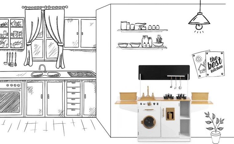 Le jeu favorise l’autonomie, les compétences sociales et l’apprentissage par imitation des adultes. Grâce à une organisation bien pensée et à des étagères de rangement, les enfants ont tout à portée de main et la cuisine reste ordonnée.