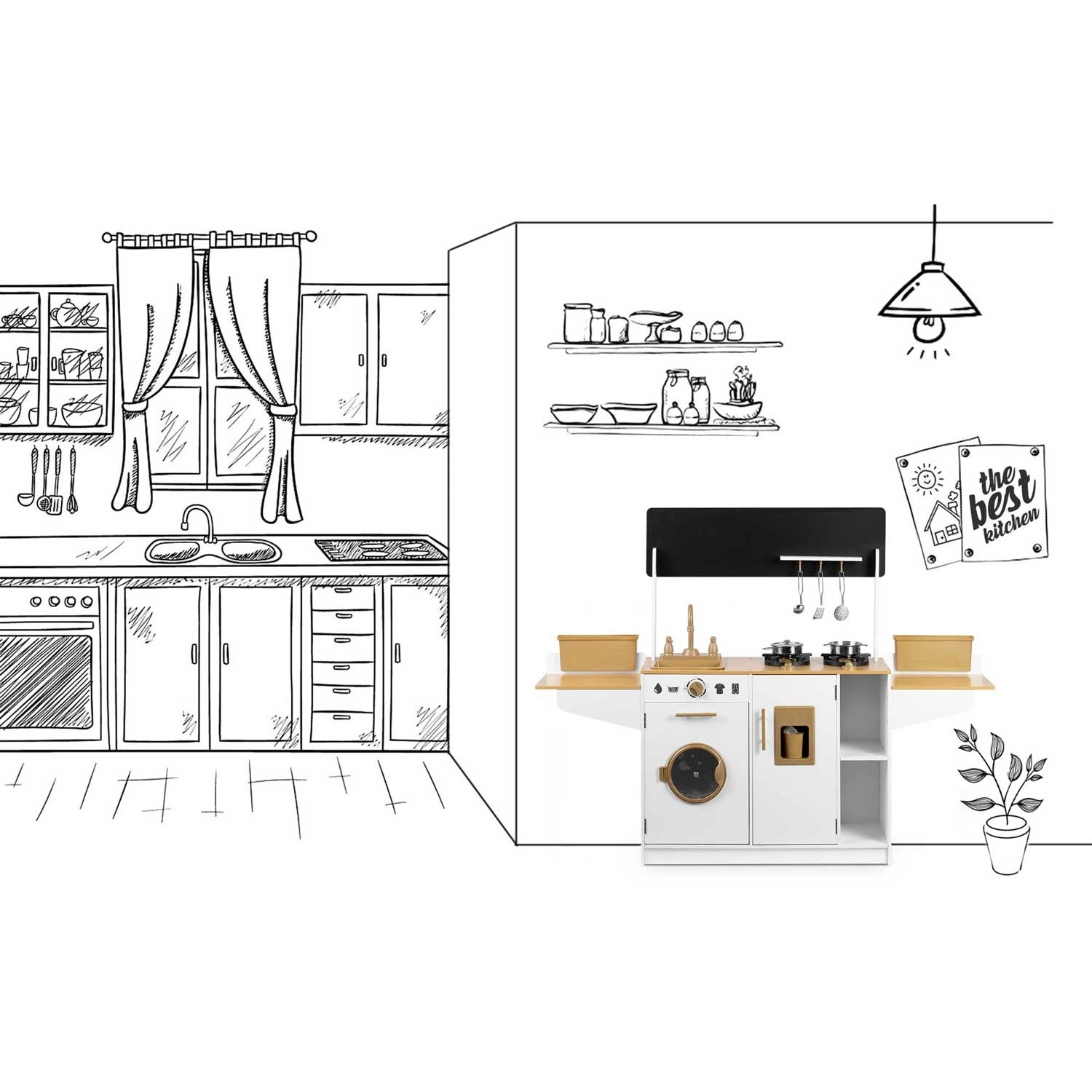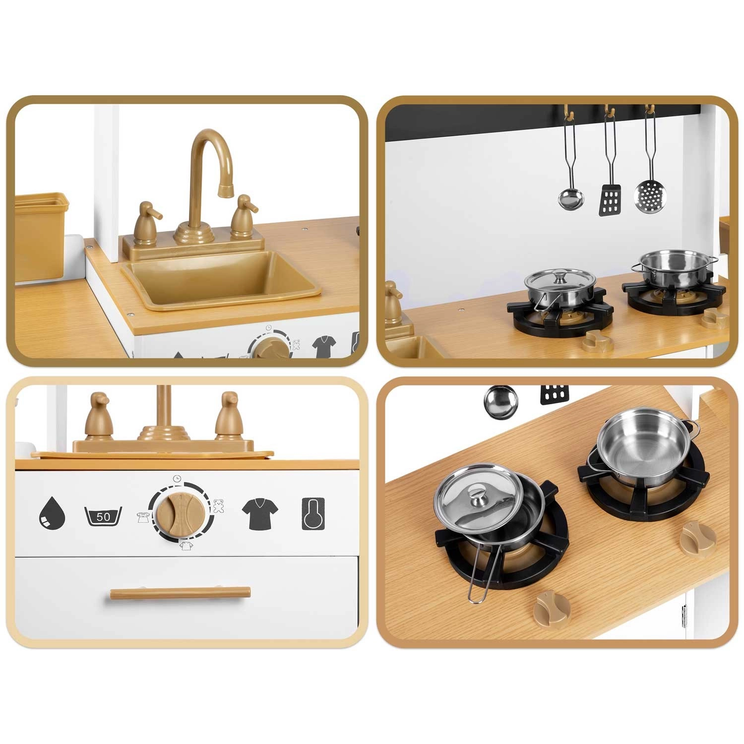 Découvrez la magie du jeu de cuisine avec la cuisine en bois robuste RICOKIDS. Elle propose des portes ouvrantes, des boutons rotatifs, de véritables robinets d’évier et un riche ensemble de vaisselle en acier inoxydable inclus. Les enfants profiteront d’un jeu d’imitation fantastique, du développement de la motricité fine, de la créativité et de la coopération entre frères et sœurs grâce à sa conception suffisamment spacieuse.