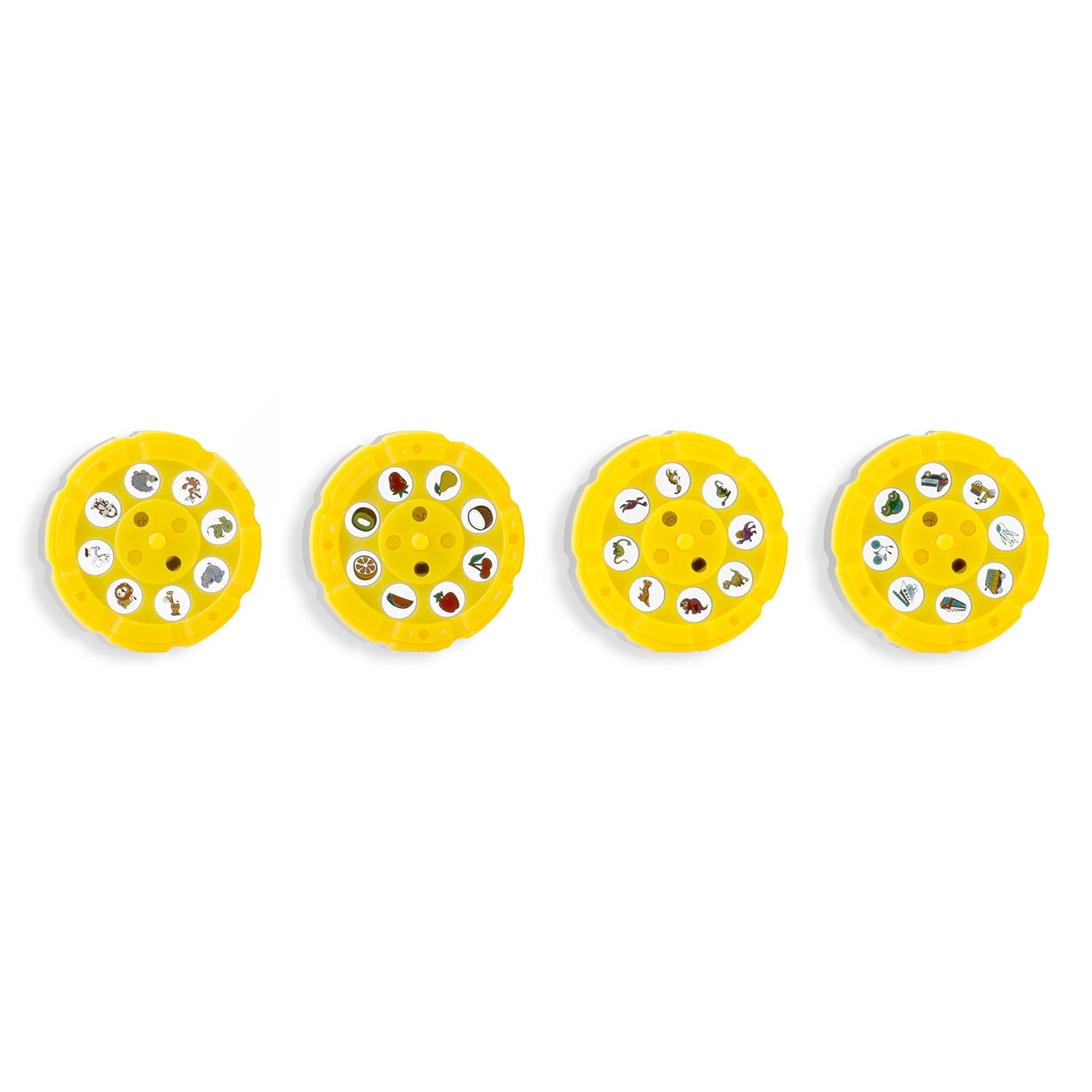 Quatre disques jaunes proposent des thèmes (dinosaures, véhicules, fruits et légumes, animaux). Les enfants choisissent facilement un motif à projeter pour le décalquer et le colorier.