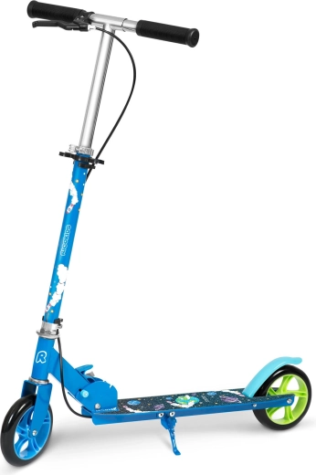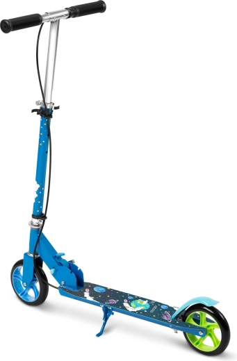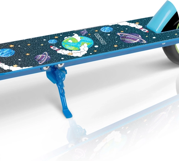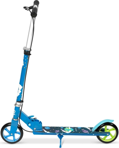 Trottinette pour enfants de 3 à 8 ans, légère et robuste, au design spatial stylé, dotée d’une structure pliable, de guidon réglable, de grandes roues PU 145 mm et d’un double système de freinage sûr – à main et au pied. Les roulements ABEC-7 garantissent une conduite fluide et silencieuse, tandis que la large plateforme antidérapante et le cadre solide avec certification EN 71 assurent la stabilité.