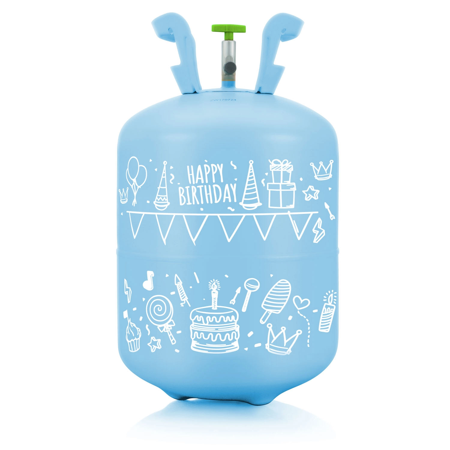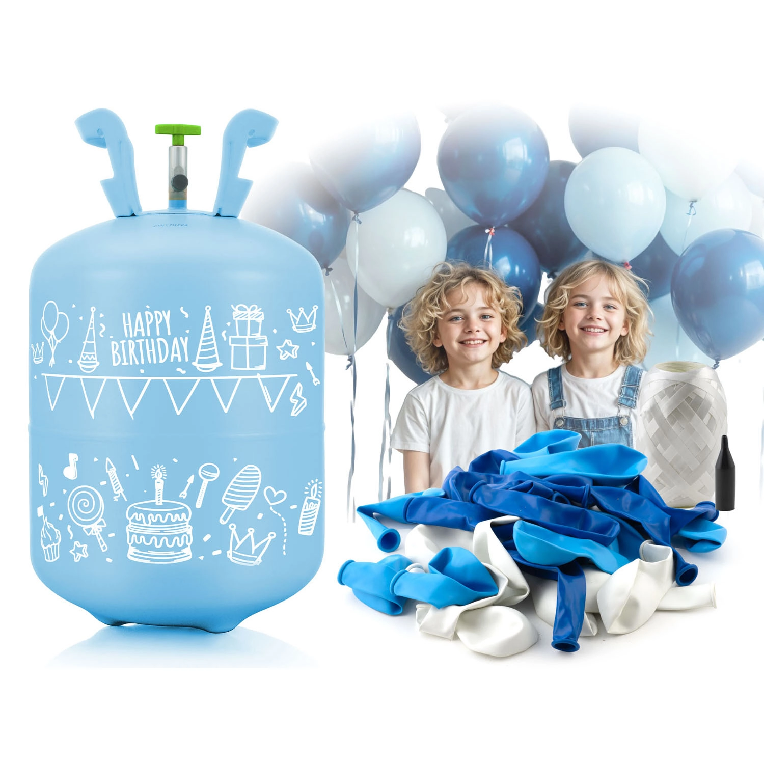 Set de fête complet pour une décoration facile : bouteille d’hélium 0,20 m³ avec mini-réducteur, 30 ballons en blanc et nuances de bleu et 40 m de ruban décoratif. Bouteille jetable et portable conforme aux normes EN71 et CE, permettant de remplir environ 30 ballons de ~23 cm de diamètre – idéale pour anniversaires, mariages, baby shower et fêtes d’enfants.