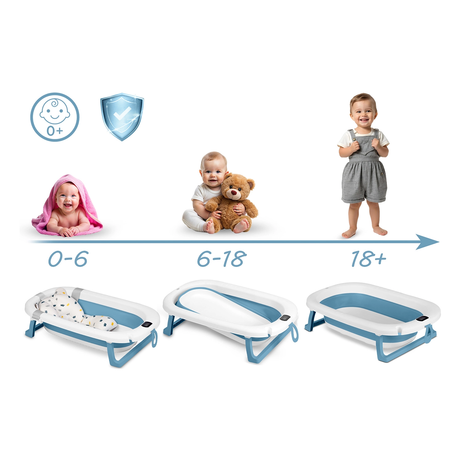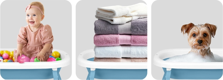 - 18+ mois : plus d’espace pour barboter en autonomie. La baignoire peut ensuite être réutilisée autrement – comme bac à balles, cuve de lavage ou pour le bain des animaux de compagnie.