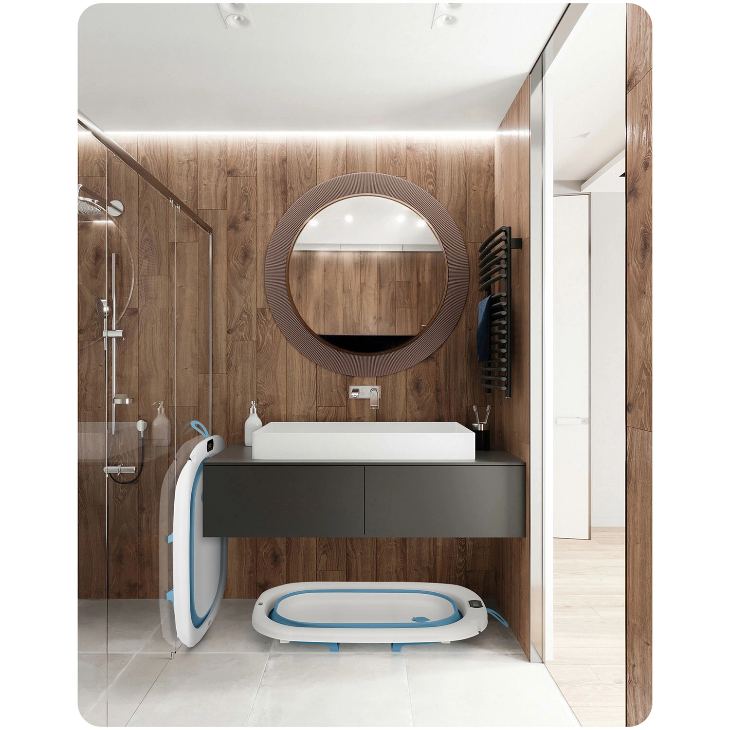 Grâce à ses pieds dépliables stables et à ses embouts antidérapants, la baignoire reste solide même sur une surface glissante. Sa structure pliante économise de la place, se transporte et se range facilement – idéale pour les petites salles de bains et les vacances. Le support pour pommeau de douche permet un remplissage pratique sans éclaboussures inutiles.