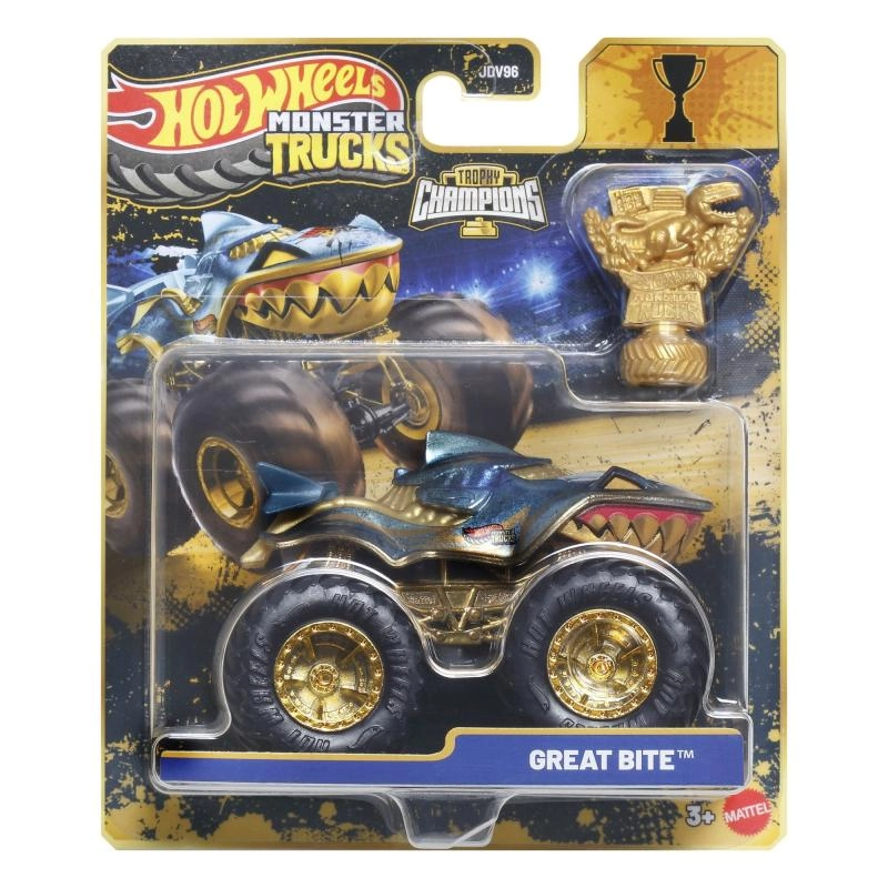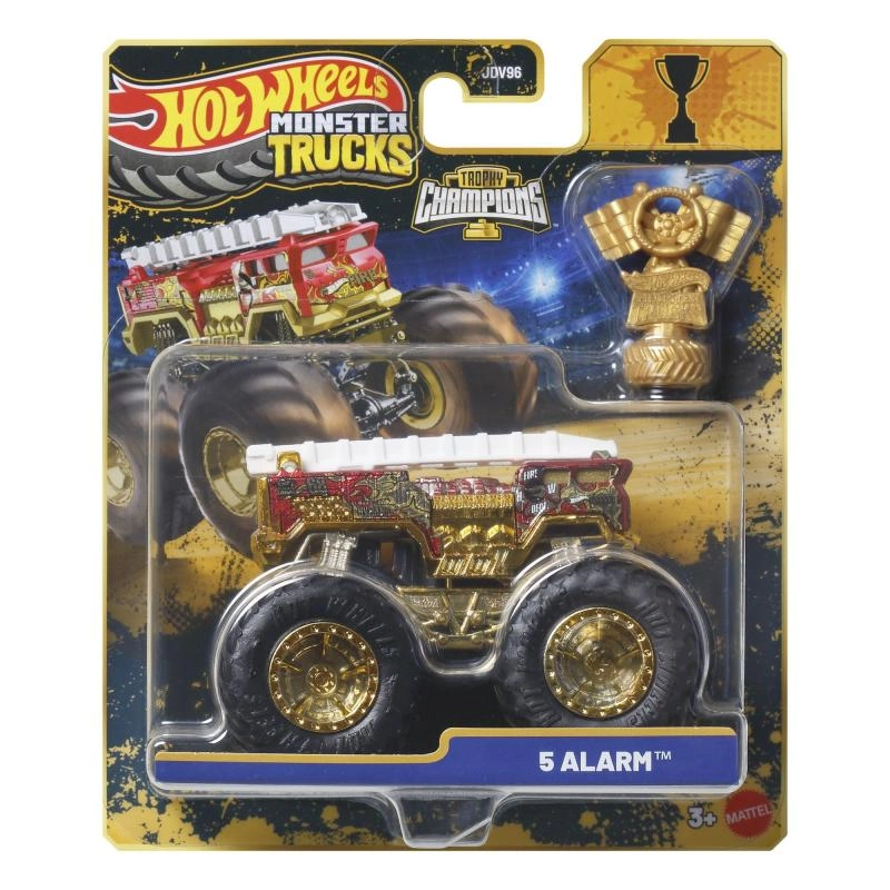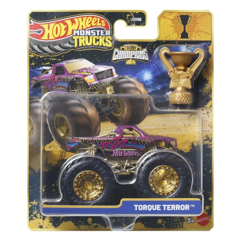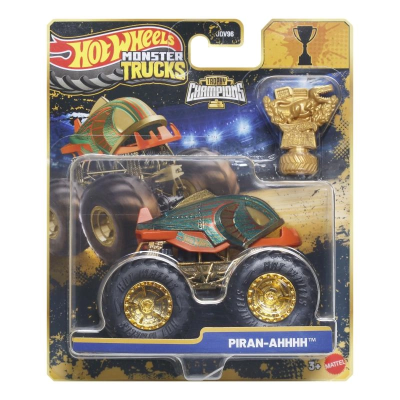 L’emballage comprend un trophée doré Hot Wheels Monster Trucks Live – idéal pour des histoires de course et une exposition percutante.