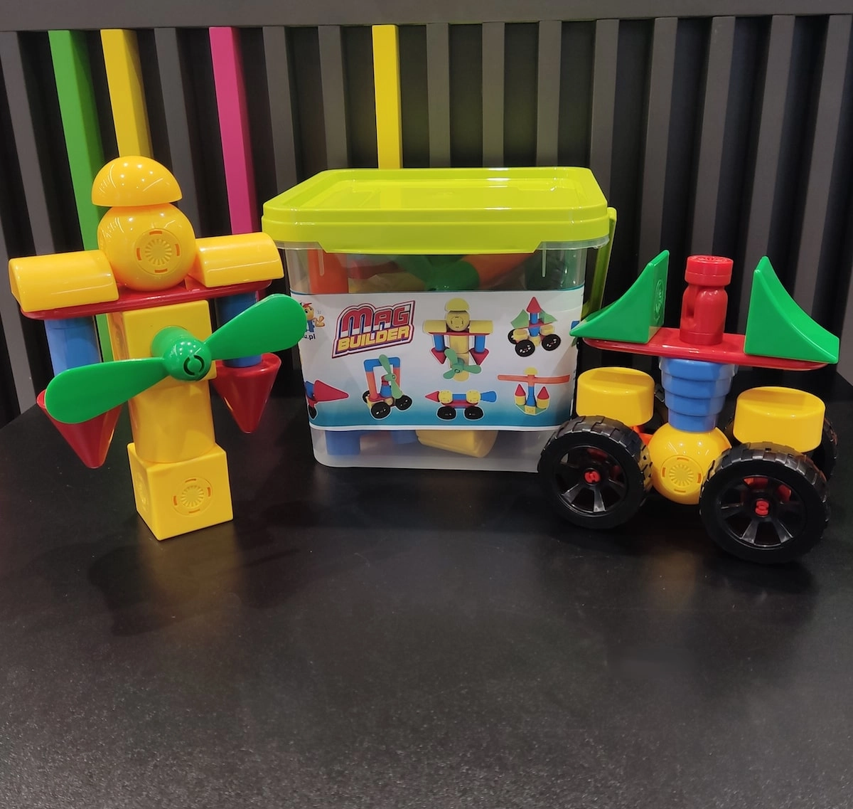 Le jeu de construction magnétique Mag Builder offre aux enfants une entrée ludique dans l’univers STEM. Des pièces comme des cônes, sphères, coudes, hélices et roues se connectent facilement et solidement grâce aux aimants, permettant aux petites mains de créer rapidement des modèles mobiles et des structures stables. Des premières idées aux véhicules élaborés, chaque modèle peut être démonté et reconstruit à tout moment.