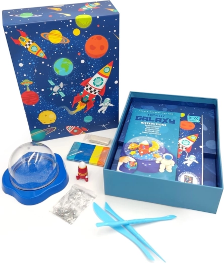 Une fois terminé, il suffit d’ajouter paillettes et eau, de fermer la boule sur son socle et d’observer la galaxie étoilée flotter autour de la fusée. La boîte galactique joliment imprimée sert d’emballage cadeau et de boîte de rangement pratique pour les trésors des enfants.