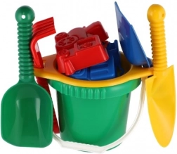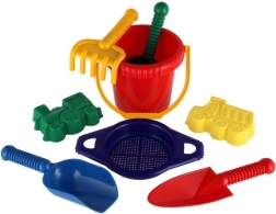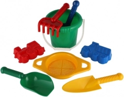 Comprend tous les outils nécessaires pour construire et jouer de manière créative dans le sable - seau, tamis, pelles, râteaux et deux moules à sable.