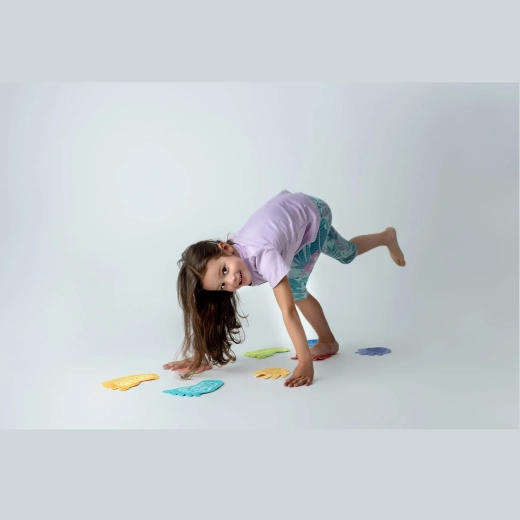 Les mains et pieds colorés guident les pas, apprennent l’appui précis, renforcent la stabilité du corps et la coordination œil-main pendant les jeux et exercices.