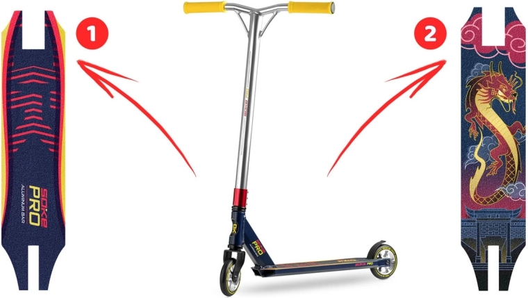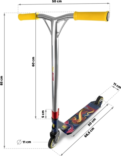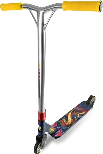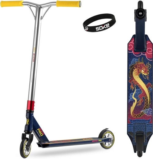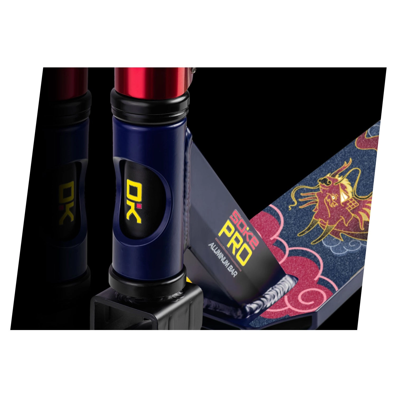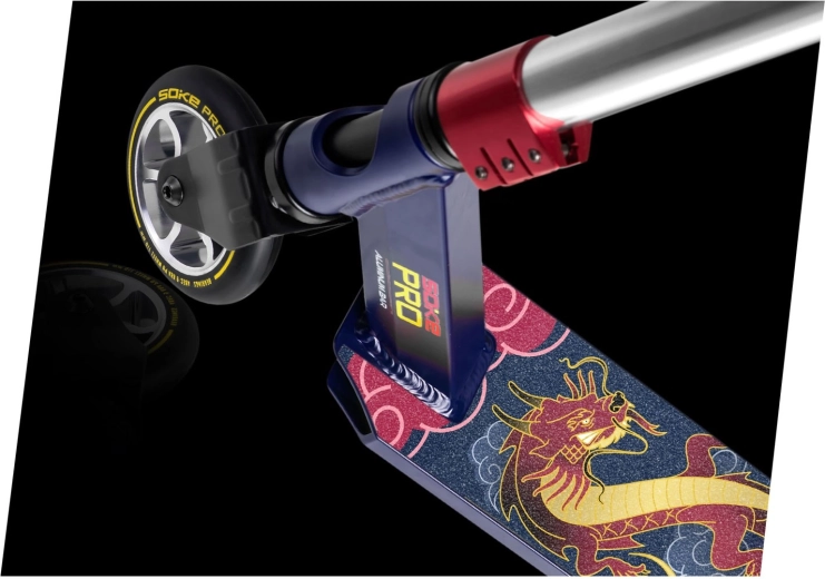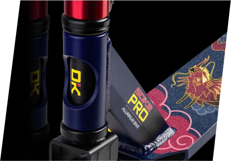 Le modèle SOKE PRO en coloris grenat‑rouge est conçu pour une progression rapide et des figures techniques. Le guidon Y‑BAR en aluminium traité thermiquement garantit une grande durabilité, tandis que le système de compression HIC avec collier triple en aluminium maintient l’ensemble fermement en place. Les poignées TPR de 145 mm offrent une prise sûre et un confort durable, même lors de longues sessions.