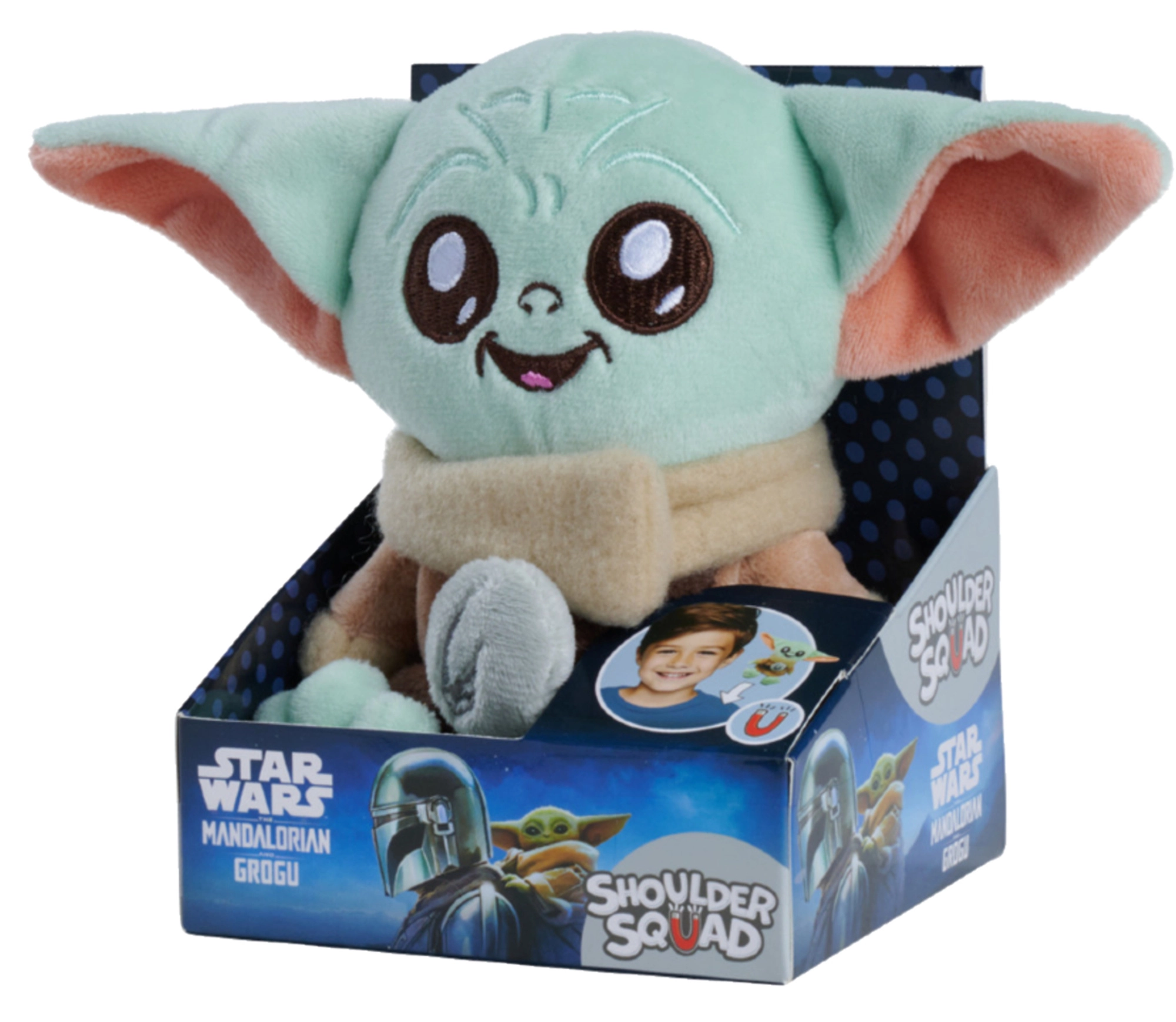 Accrochez votre héros préféré à votre épaule et partez à l’aventure ! La figurine en peluche Grogu (Baby Yoda) de STAR WARS: The Mandalorian est conçue pour tenir confortablement et en toute sécurité sur votre épaule grâce à un système d’attache magnétique. Il suffit de glisser l’aimant sous le vêtement et de placer la peluche par-dessus.