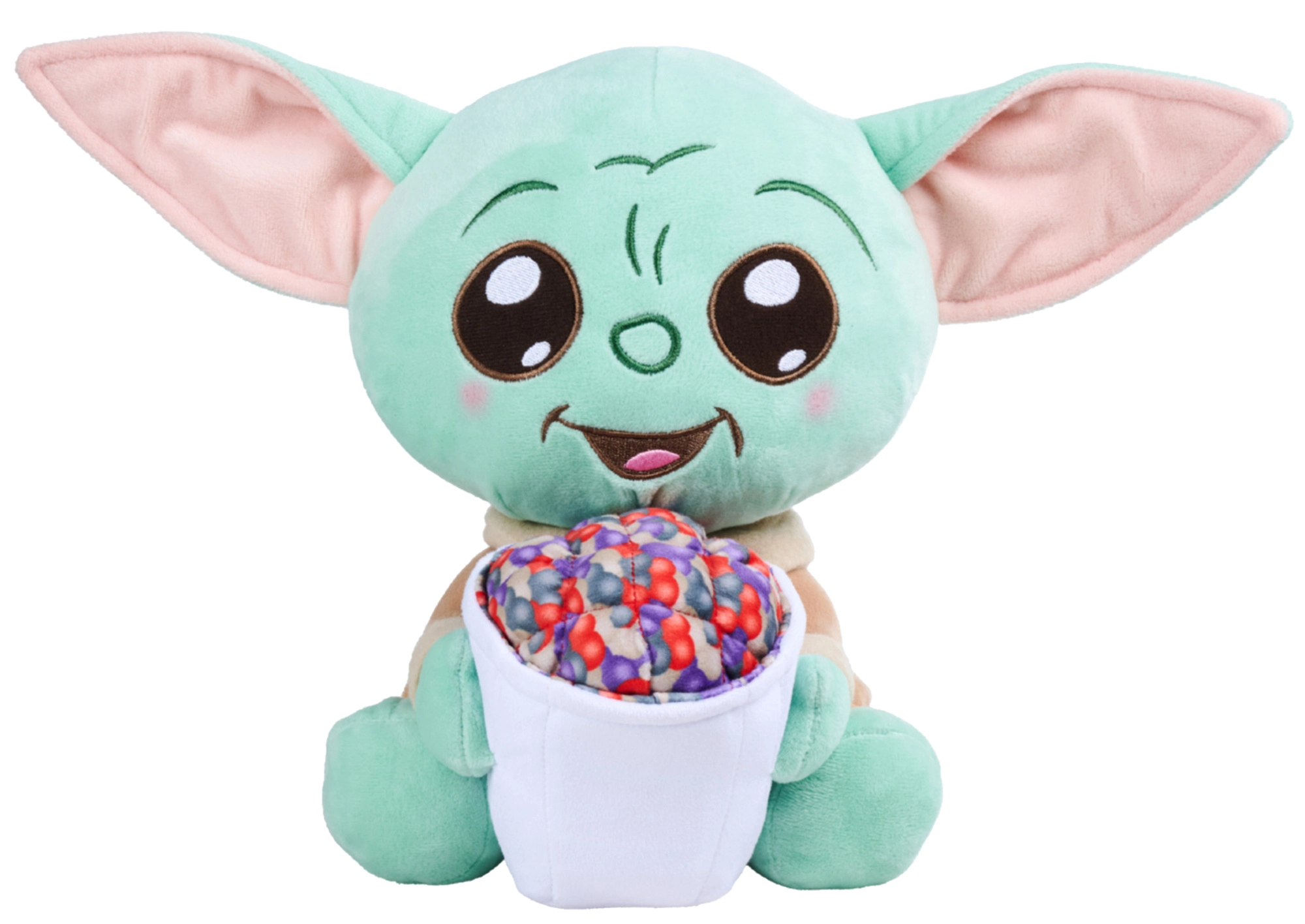 Le motif ludique avec du pop-corn fait référence à des scènes appréciées de The Mandalorian et fait de cette peluche une pièce originale pour la collection.