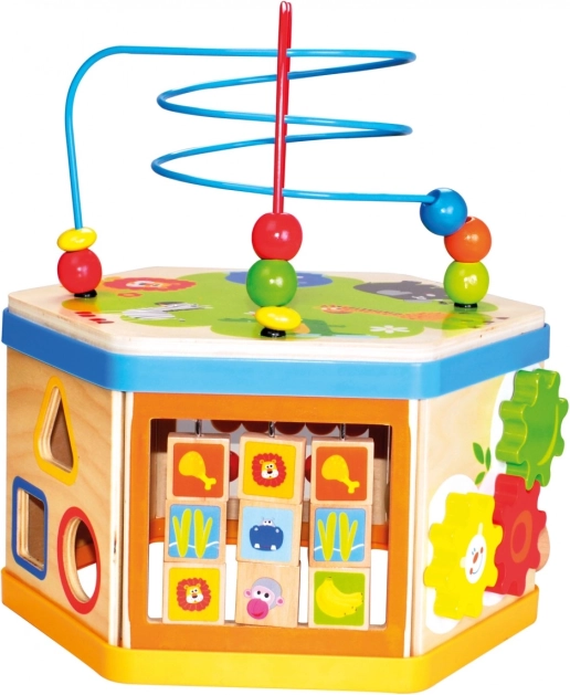 Ce jouet d’éveil multiface captive les enfants curieux grâce à ses couleurs vives et à la multitude d’activités à dimension didactique. Ils peuvent faire glisser des perles dans un labyrinthe, compter des billes, déplacer des icônes d’animaux, les faire tourner et leur associer la nourriture, faire tourner des engrenages, encastrer des formes et apprendre à reconnaître l’heure. Le jouet est robuste, fabriqué en contreplaqué épais. Principales caractéristiques : cube avec couvercle et 3 éléments d’encastrement, développe l’orientation dans l’espace et le temps, associe formes et couleurs, exerce la motricité fine, réalisation robuste en bois.