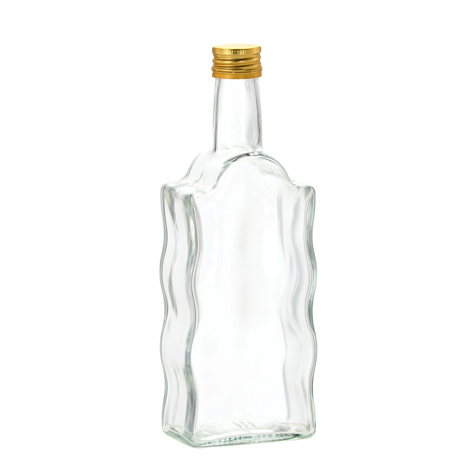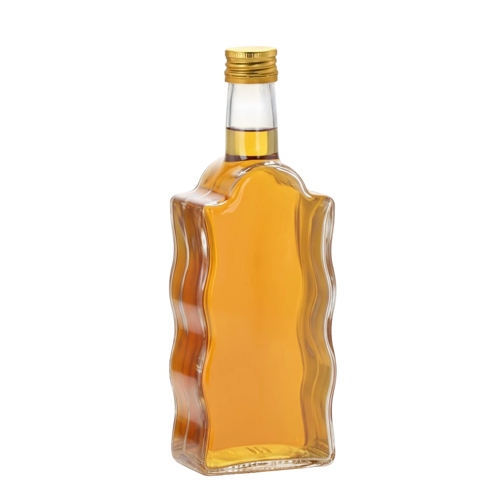 Élégante bouteille en verre Fala de 500 ml, idéale pour les liqueurs maison, le vin, les jus et les sirops. Fabriquée en verre transparent résistant pour un stockage sûr et un contrôle facile de la quantité. Sa forme stylée avec côtés ondulés est complétée par un bouchon à vis métallique 28 mm, garantissant une fermeture hermétique. La bouteille est compatible lave-vaisselle et convient également parfaitement comme emballage cadeau pour boissons maison.