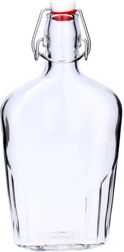 La bouteille en verre Fiaschetta de 500 ml est idéale pour les liqueurs maison, jus et huiles. Elle offre un design élégant, une fermeture mécanique pratique avec clip métallique et un joint en silicone pour une fermeture sûre et hermétique. Le verre de qualité résistant garantit une longue durée de vie et préserve la fraîcheur et les arômes.