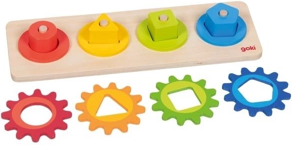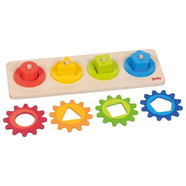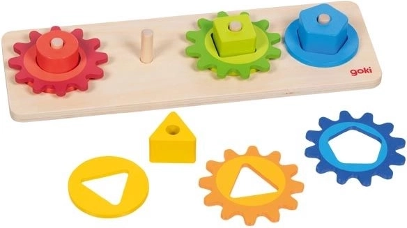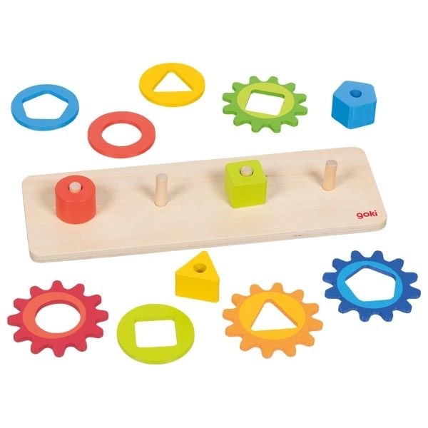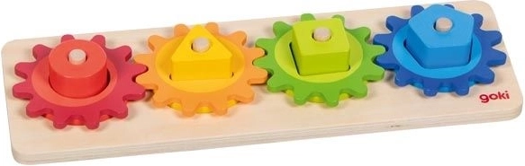 Les roues dentées reliées s’animent toutes lorsqu’on en tourne une. L’enfant découvre ainsi le principe de cause à effet et améliore sa coordination œil-main.