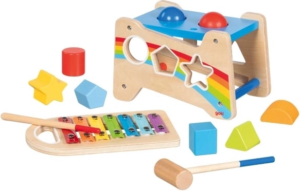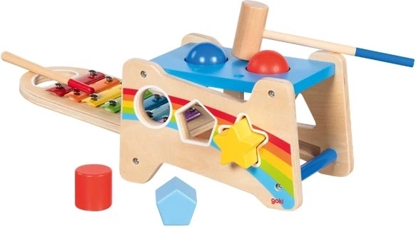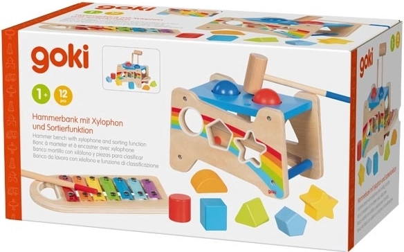 Ce jouet astucieux de Goki encourage les enfants à explorer les formes, les couleurs et les sons. Le banc à marteler avec deux billes procure le plaisir de l’action, le xylophone coulissant transforme le jeu en petit concert et la boîte à formes entraîne la logique et la coordination œil–main. Grâce à ses dimensions compactes, il est parfait pour la chambre d’enfant comme pour les déplacements.