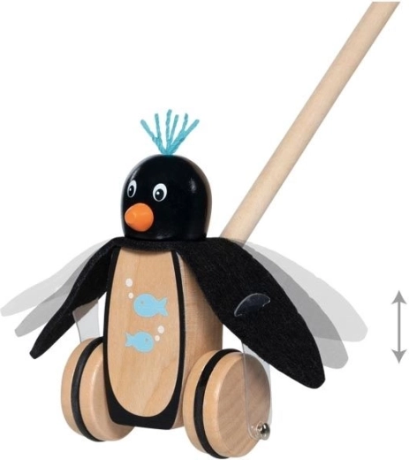 Adorable manchot en bois à pousser sur tige, idéal pour les petits explorateurs qui apprennent à marcher. Grâce à ses ailes en feutre, ses roues stables avec pneus en caoutchouc et sa poignée ergonomique, il offre une conduite fluide et sûre, à la maison comme en extérieur. Fabriqué en bois massif de haute qualité pour une grande durabilité et une sécurité optimale.