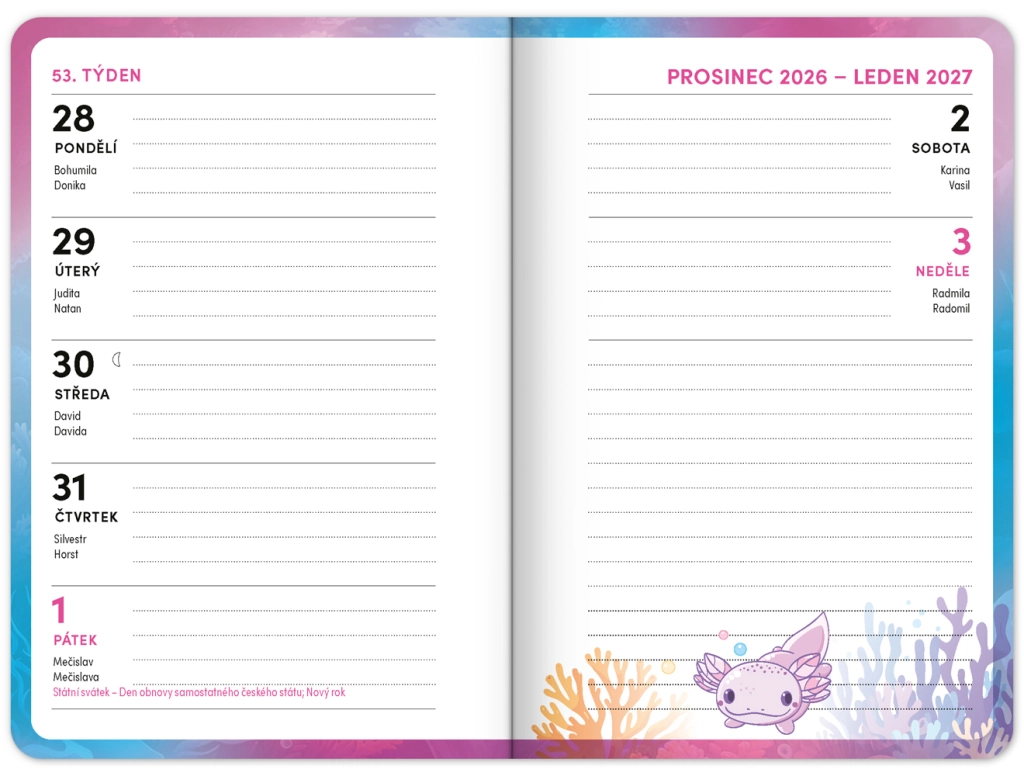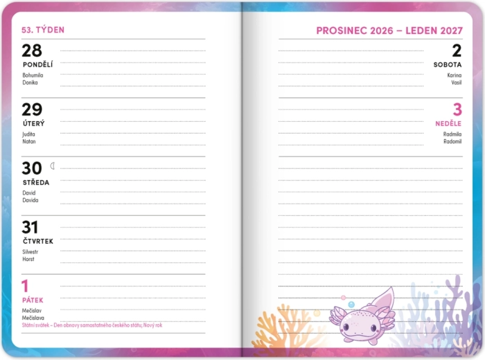 Gardez le contrôle de vos devoirs scolaires avec l’agenda au motif Axolotl. Grâce à ses dimensions compactes de 9,8 × 14,5 cm, il se glisse dans tout cartable ou sac à dos, et sa structure claire de septembre 2026 à décembre 2027 facilite la planification des examens, des devoirs et du temps libre.