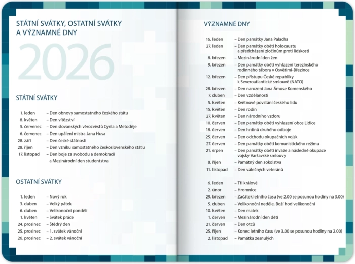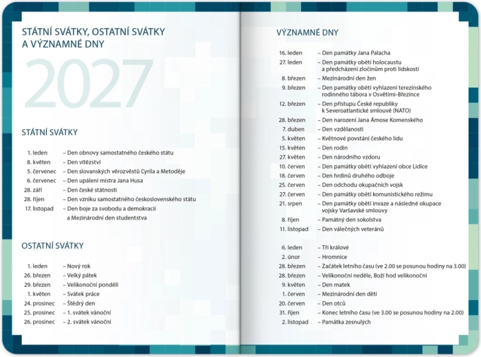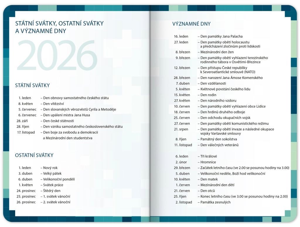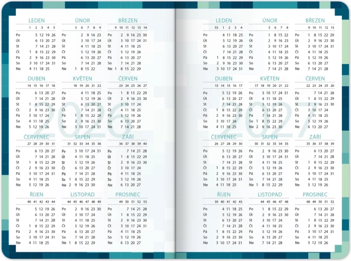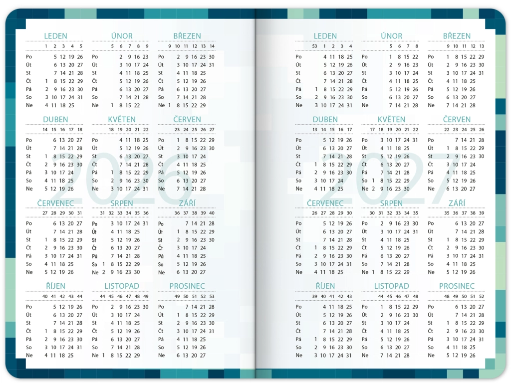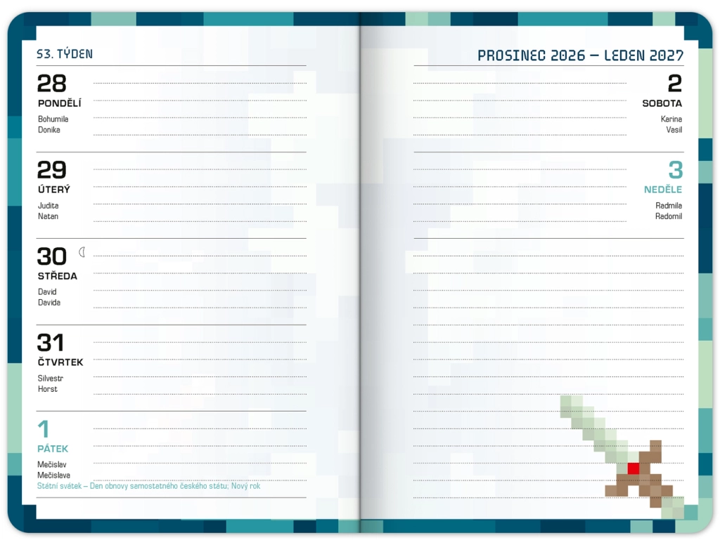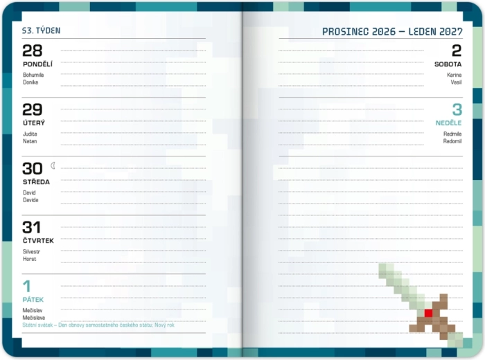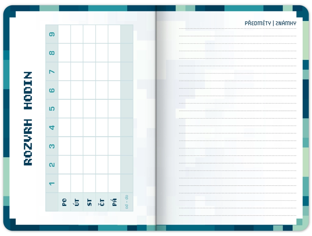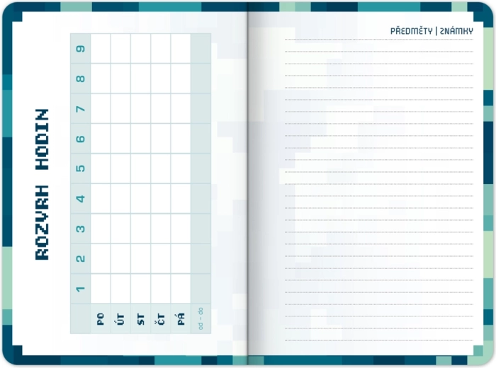 Agenda scolaire stylé au motif de jeu vidéo de construction pour une année scolaire claire de septembre 2026 à décembre 2027. Il propose des aides-mémoire pratiques en tchèque, mathématiques et anglais, des emplois du temps et un aperçu des vacances dans un format compact de 9,8 × 14,5 cm – idéal pour le sac à dos ou le cartable.