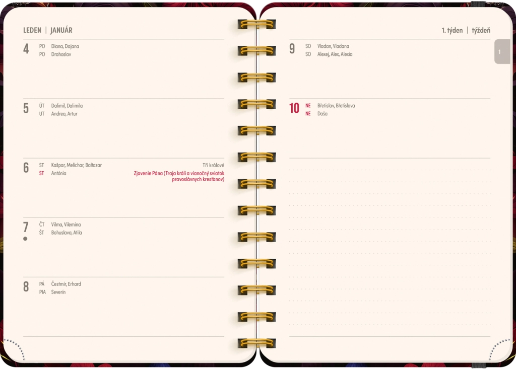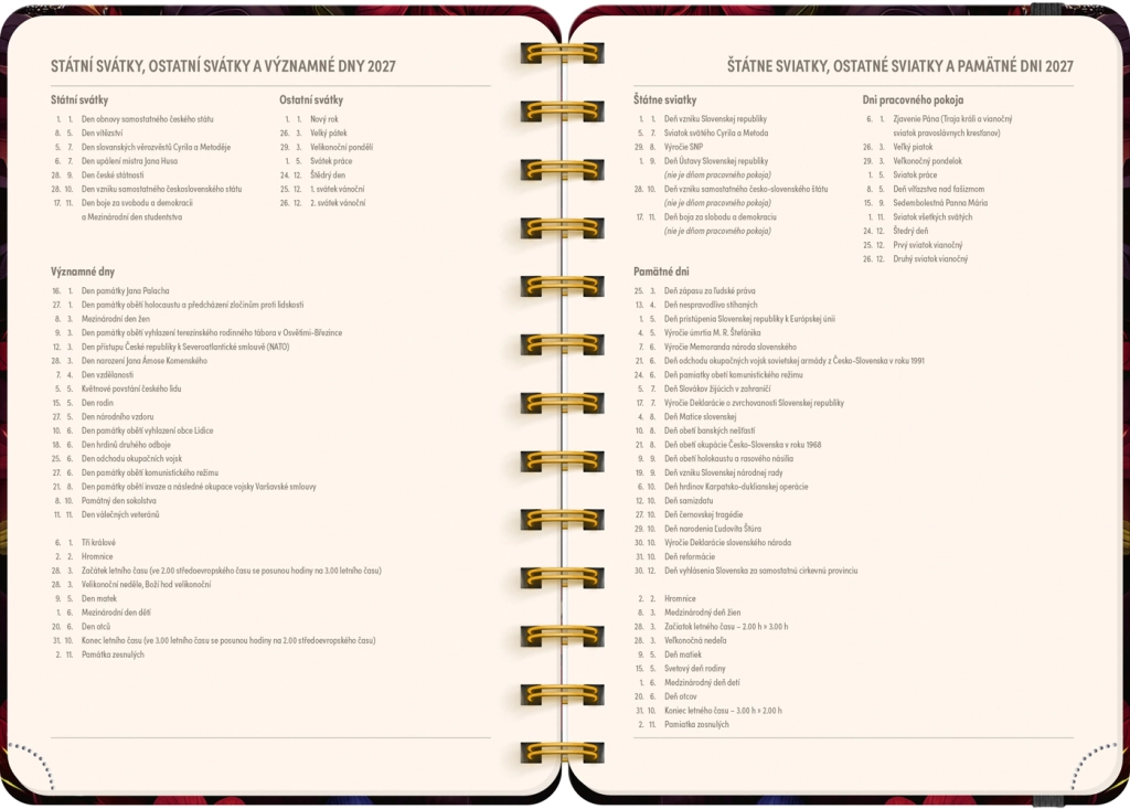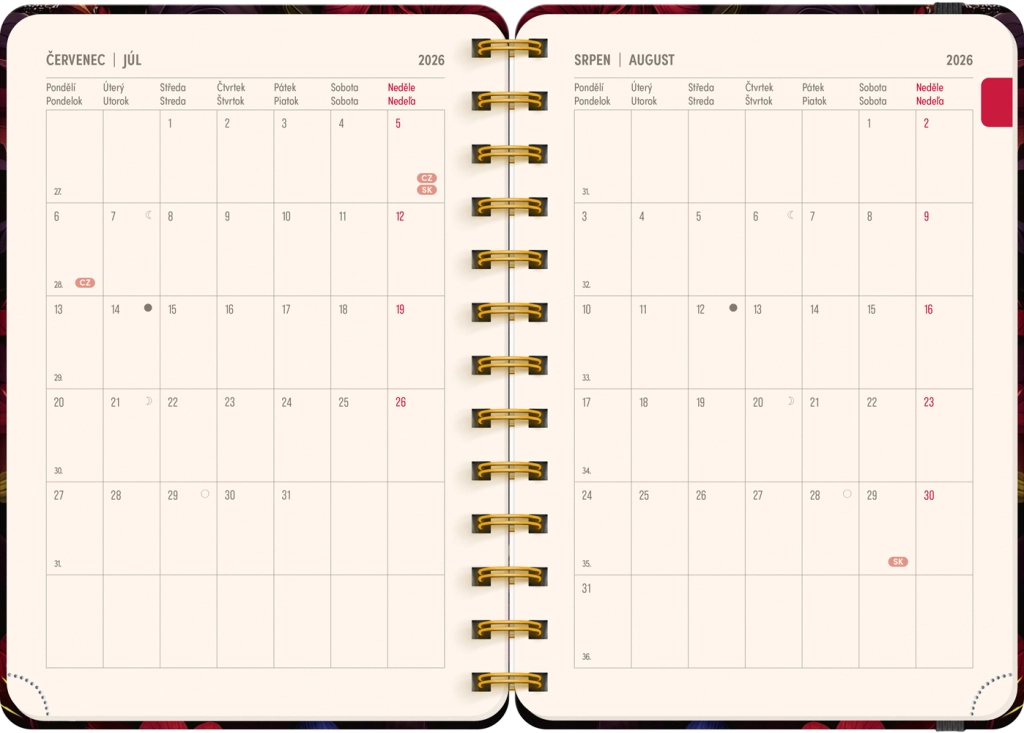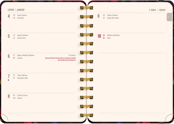 Élégante agenda de 18 mois au motif de fleurs rouges pour la période 07/2026–12/2027, proposant un calendrier hebdomadaire tchéco‑slovaque avec prénoms et jours de fête, des aperçus des années 2026 et 2027, ainsi que beaucoup d’espace pour les notes chaque semaine. Format compact 13 × 18 cm et reliure spirale pour écrire confortablement à la maison comme en déplacement.