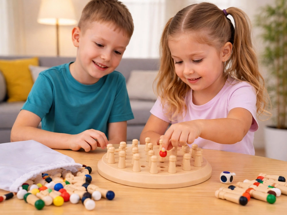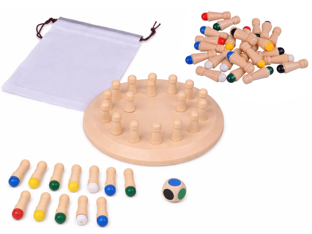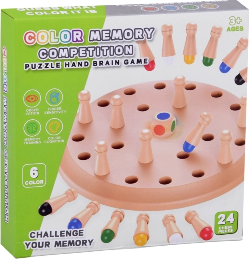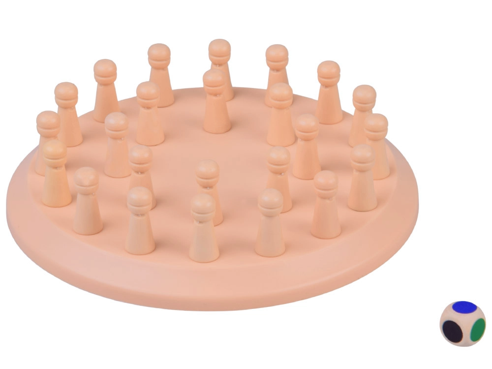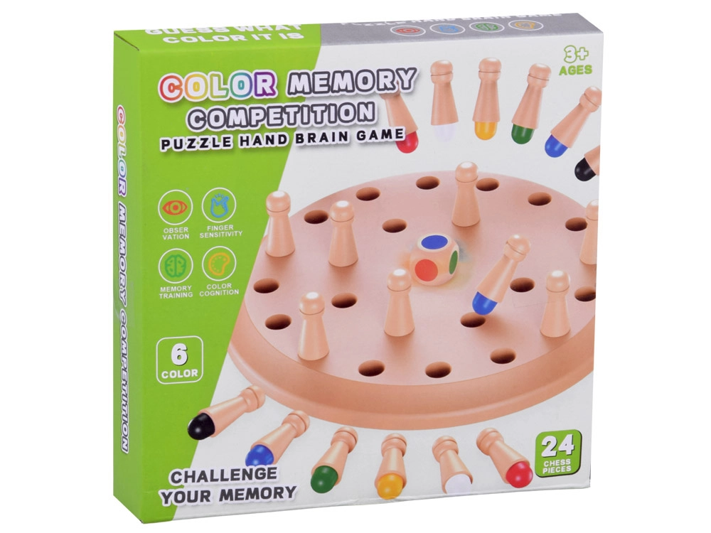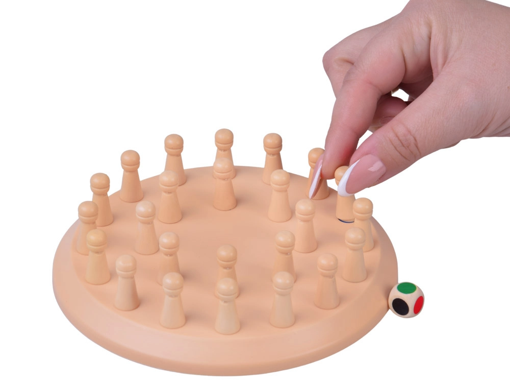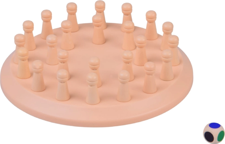 Un plateau circulaire en bois avec des trous et des chevilles cache des couleurs que les joueurs doivent mémoriser. Après avoir lancé le dé coloré, ils essaient de révéler la cheville correspondant à la couleur. Si le choix est correct, ils gagnent la cheville ; sinon, elle est remise en place – au tour du joueur suivant. Ce jeu est excellent pour développer la mémoire visuelle, les associations et la motricité fine.