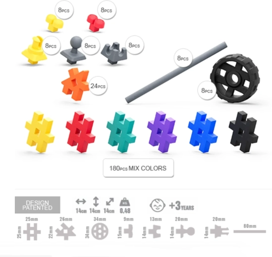 Des pièces souples et agréables qui s’emboîtent sans grand effort. Les enfants entraînent ainsi confortablement leur motricité fine et leur concentration en construisant leurs propres idées.