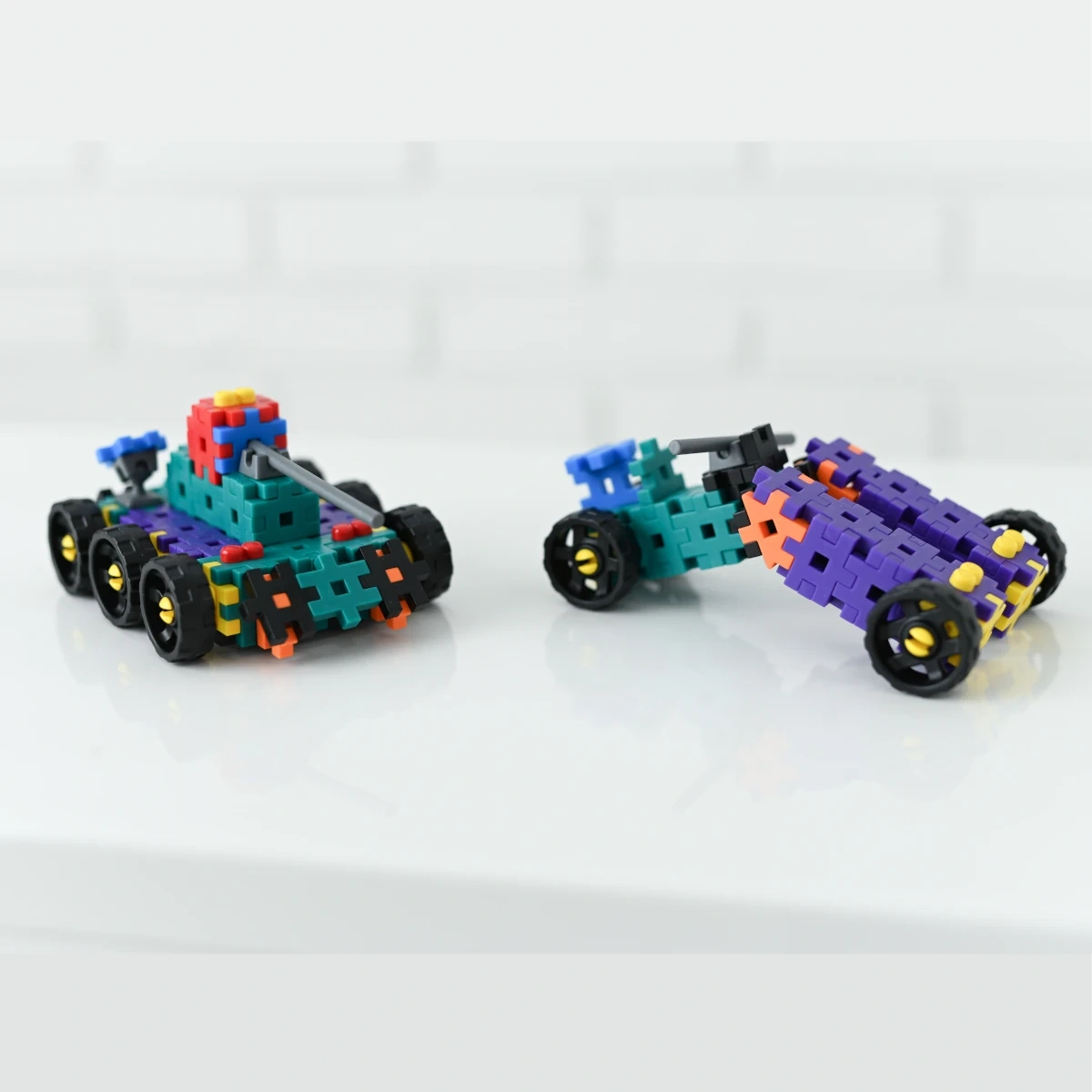 Les roues, axes et connecteurs permettent de créer des modèles qui roulent et bougent réellement. Les enfants découvrent naturellement les bases de la mécanique.