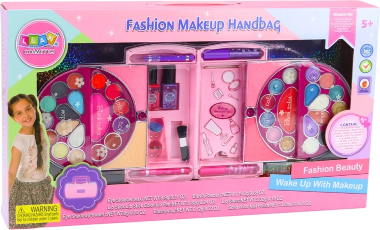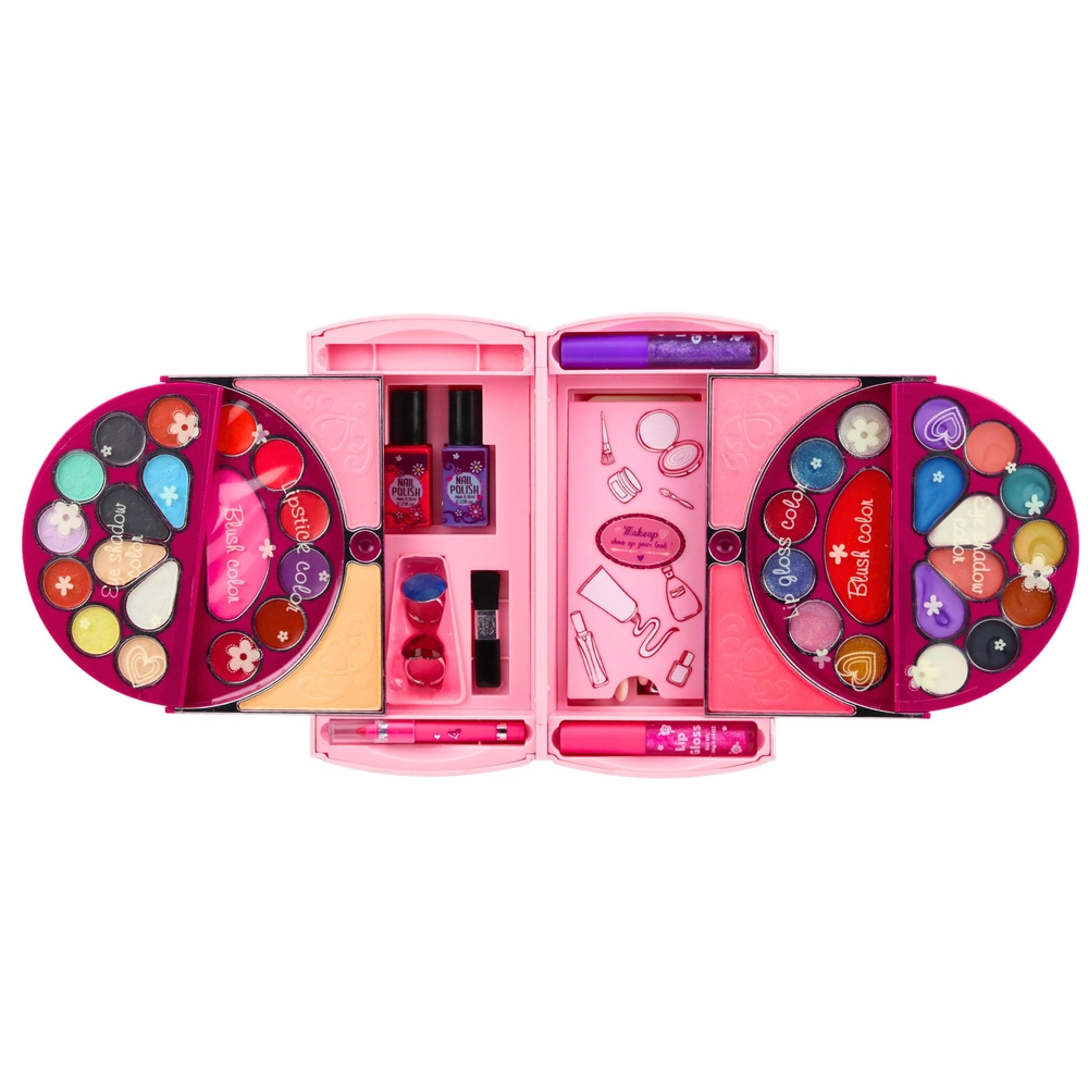 Grand coffret pliant rose pour petites amatrices de maquillage, offrant un ensemble complet de maquillage pour enfants et d’accessoires pour les ongles. Une fois ouvert, il se transforme en une palette claire et organisée avec fards à paupières, blushs, gloss et vernis, complétée par un miroir sécurisé, des applicateurs et des éponges. La cosmétique est douce pour la peau des enfants, facile à rincer à l’eau et parfumée d’un arôme sucré‑fruité – idéale pour le jeu créatif et les premiers pas dans l’univers de la beauté.