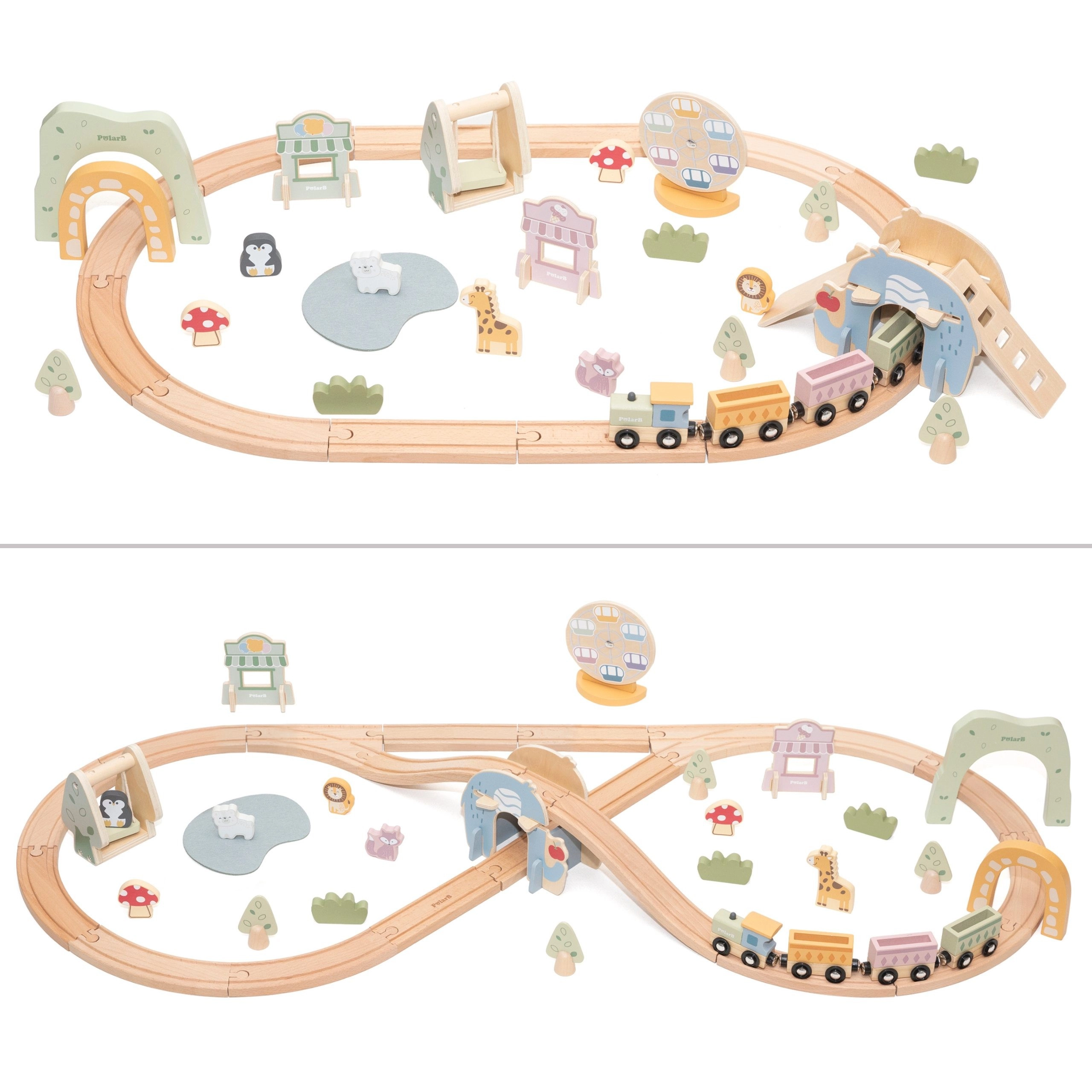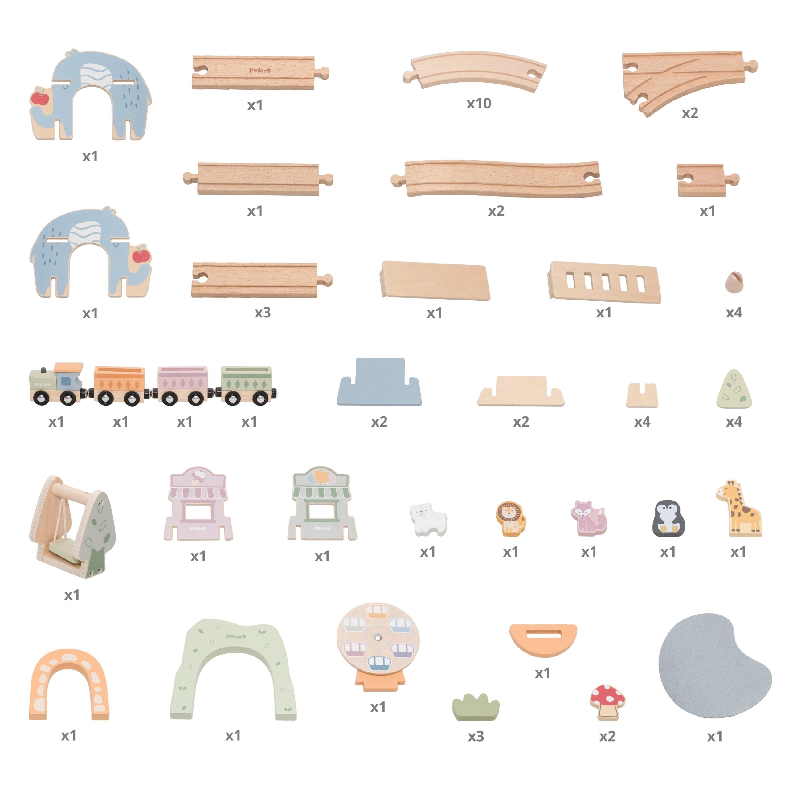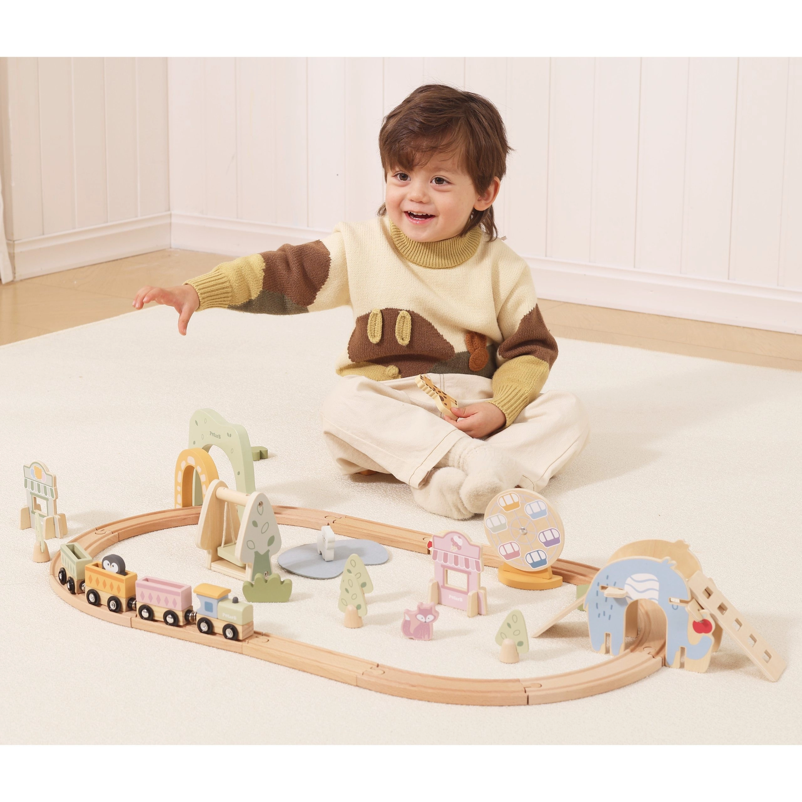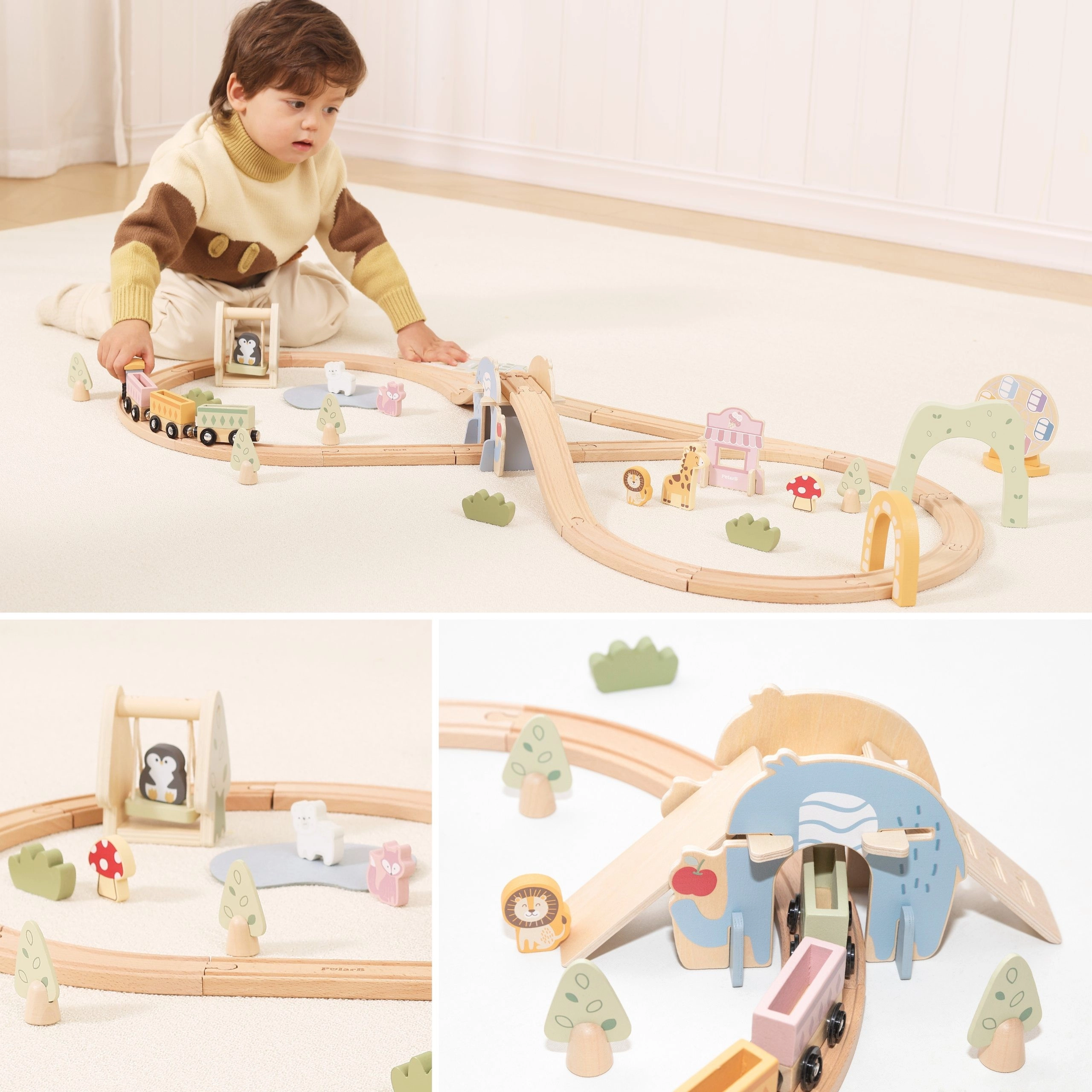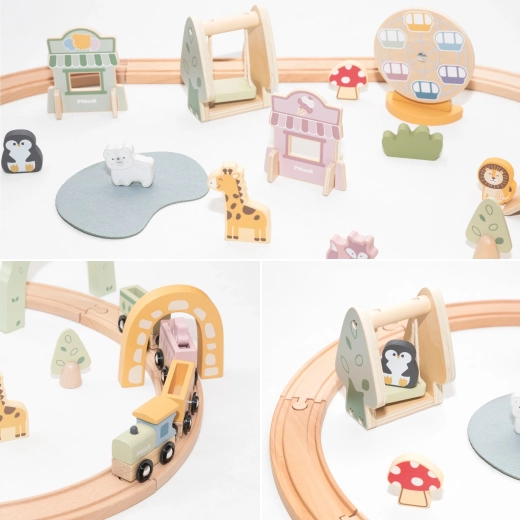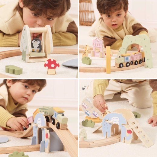 Le set comprend aussi de jolies figurines d’animaux, des arbres, des bâtiments et des éléments de « ville joyeuse », qui apportent histoires et émotion au jeu. Grâce à la palette pastel et aux bords lisses, l’ensemble est non seulement sûr, mais aussi esthétiquement agréable dans une chambre d’enfant.