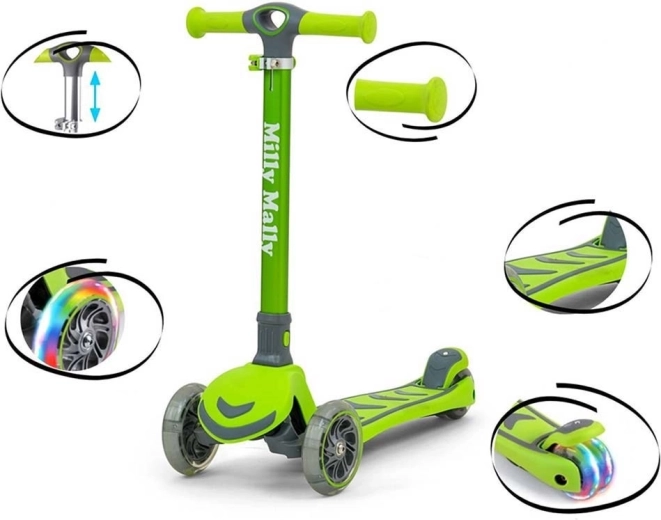 Trottinette pour enfants légère et durable Milly Mally Boogie en vert, qui ravira les petits riders dès 3 ans. Elle offre une construction stable à trois roues avec double roue arrière, roues avant lumineuses et une structure en aluminium pour une longue durée de vie. Direction par inclinaison du corps, guidon réglable en hauteur et plateau antidérapant pour une conduite sûre et amusante.