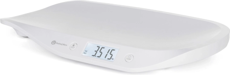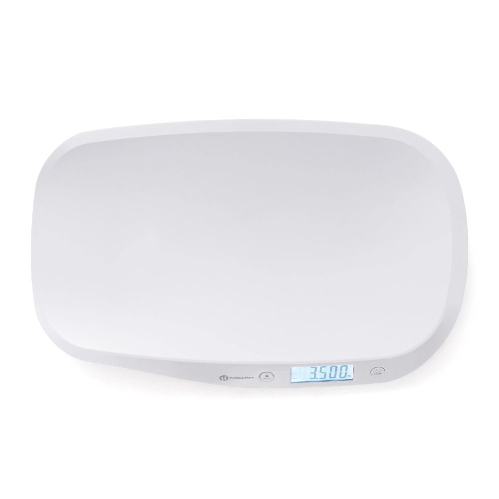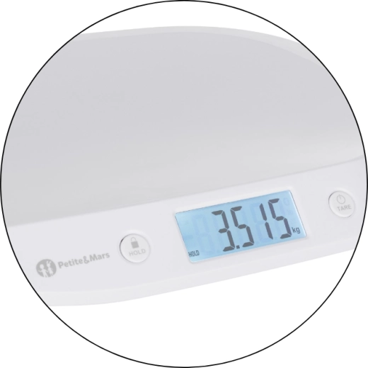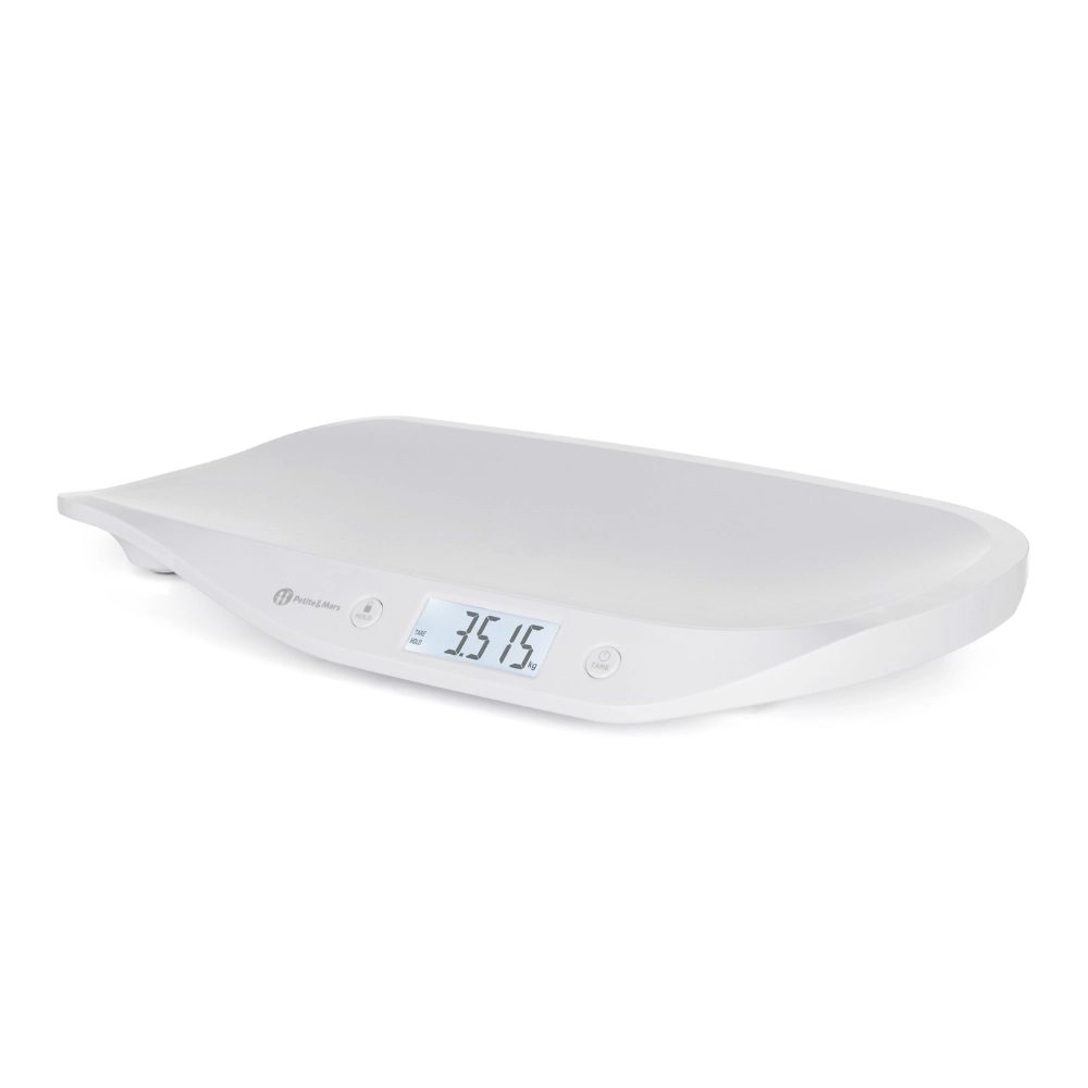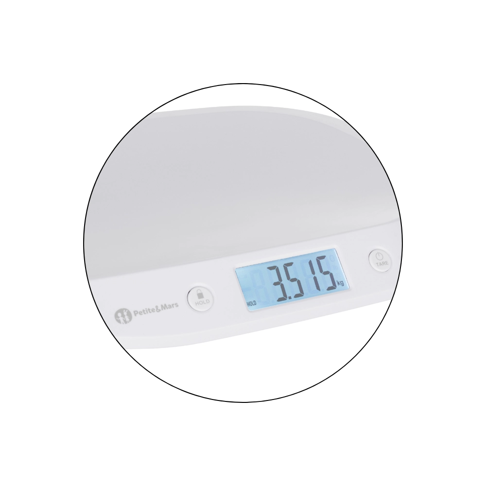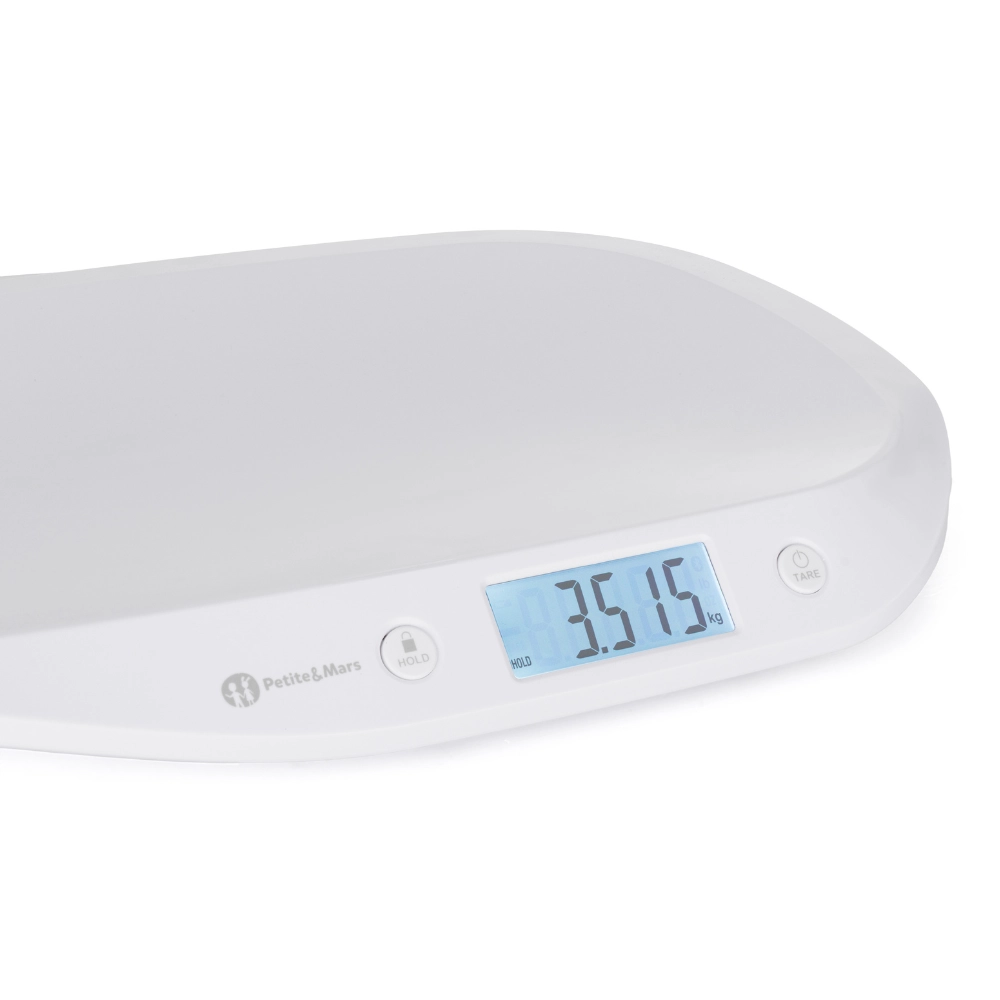 Suivez en toute fiabilité la croissance de votre bébé avec la balance bébé numérique PETITE&MARS Balance. Elle offre un écran LCD rétroéclairé pour une lecture aisée, une fonction HOLD automatique et manuelle pour un résultat stable même lorsque bébé bouge, ainsi qu’une fonction TARE pour soustraire le poids d’un linge. La plateforme de pesée ergonomique et incurvée assure sécurité et confort. Plage de pesée 0,1–20 kg, pas de 5 g et unités kg/lb/oz.