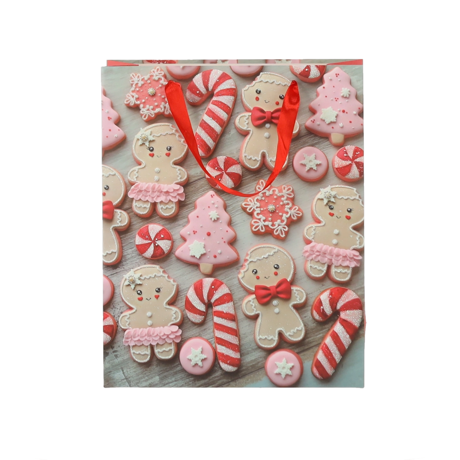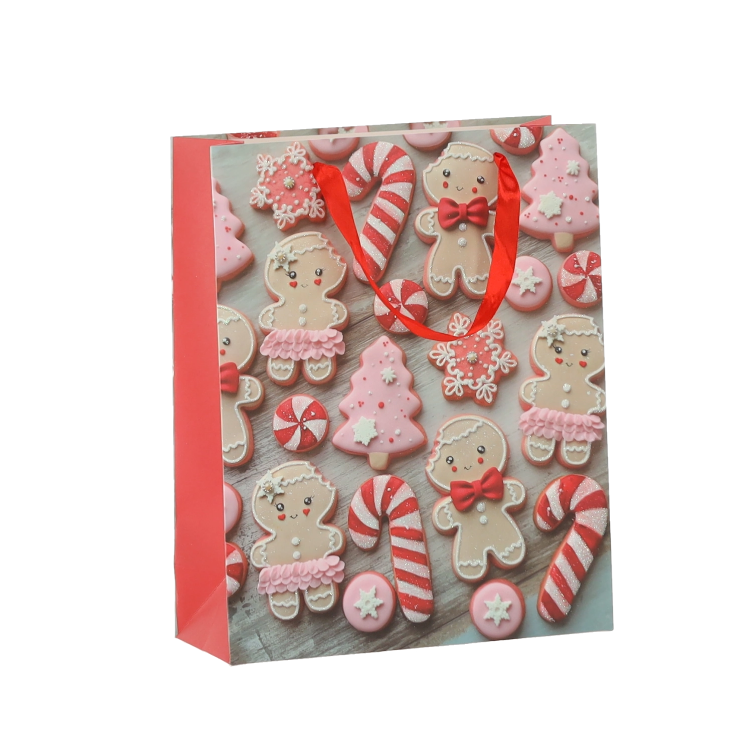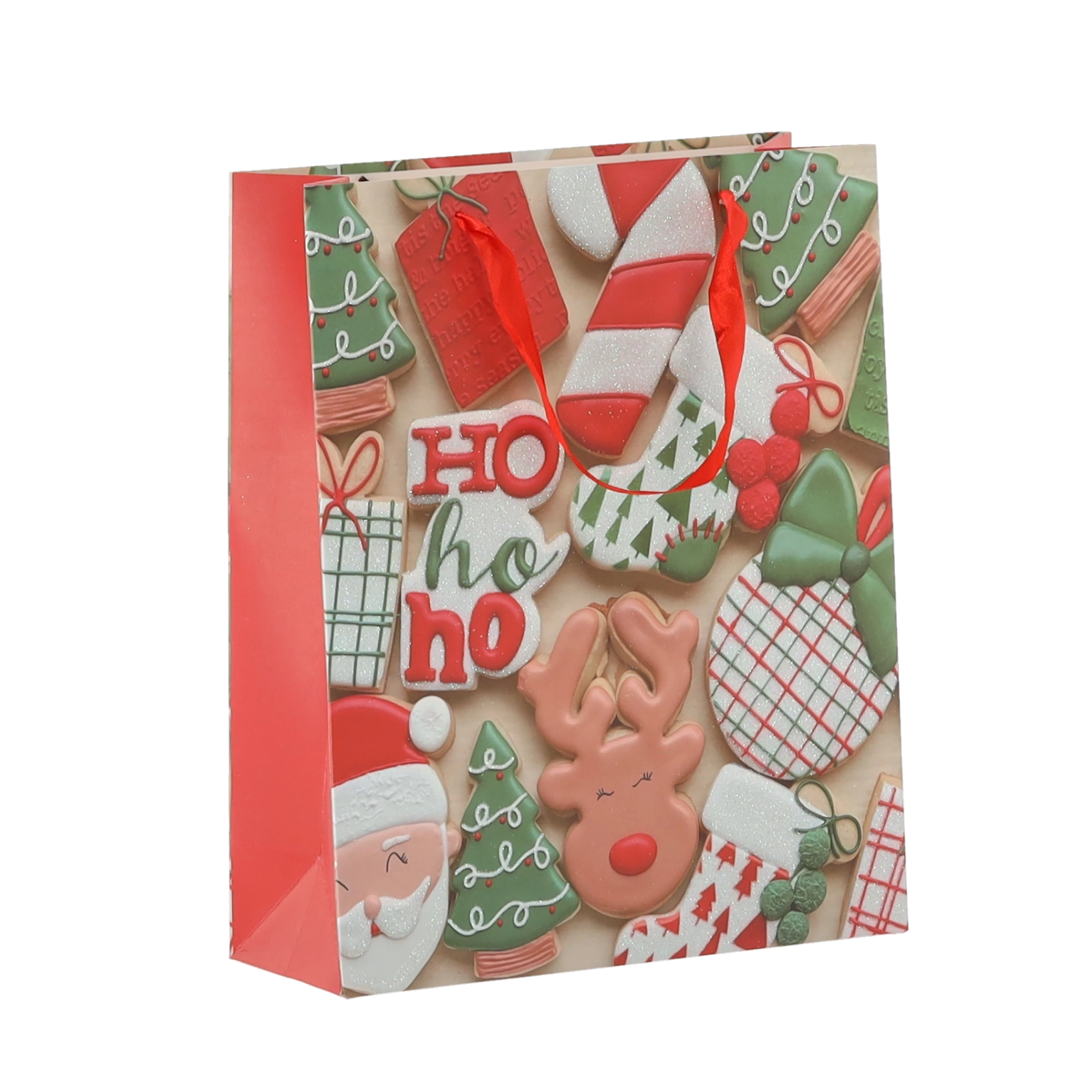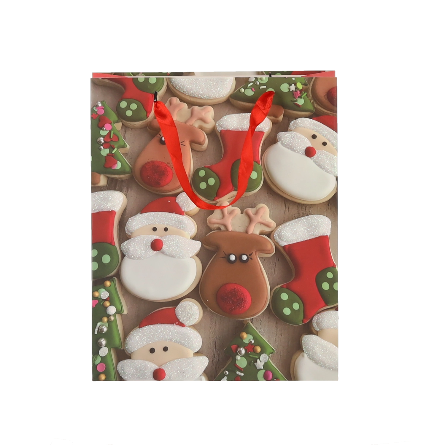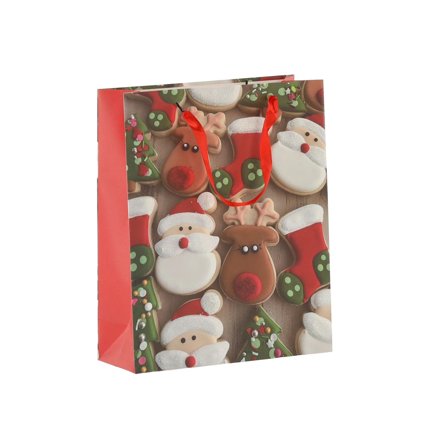 Pratique lot de 12 sacs-cadeaux de Noël au format 18 × 24 × 8 cm pour un emballage rapide et stylé des petits présents. Les sacs en papier de qualité avec un grammage de 157 g/m² sont solides et résistants, disposent d’une anse en ruban rouge pour un port confortable et d’un motif joyeux de biscuits de Noël – Père Noël, renne, sapins et moufles. Idéal pour cosmétiques, bijoux et petits livres.
