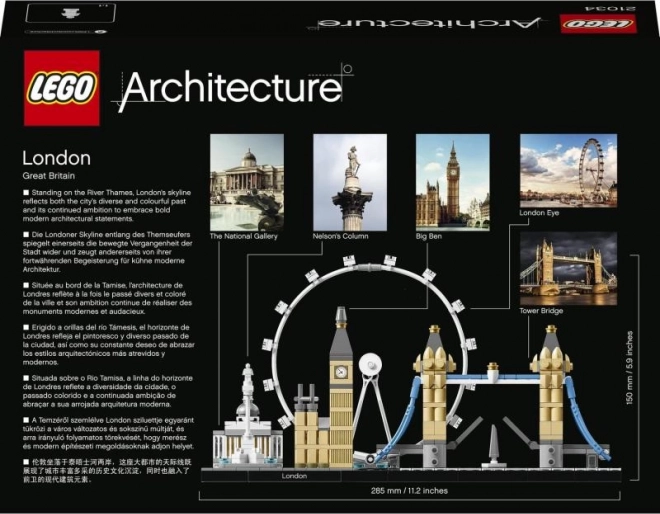 Ce set de la collection LEGO Architecture Skyline reproduit fidèlement les monuments londoniens les plus célèbres avec des proportions et des couleurs réalistes. Sur un socle élégant avec une plaque décorative « London », retrouvez la National Gallery, la colonne de Nelson, le London Eye, Big Ben (Elizabeth Tower) et le Tower Bridge. Des éléments transparents à la base représentent le cours de la Tamise, offrant un rendu superbe sous tous les angles.