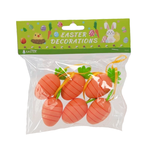 Apportez une ambiance printanière et pascale à votre intérieur avec un lot de six carottes décoratives munies d’une boucle. Ces petites carottes ont un aspect réaliste, des couleurs vives et, grâce à la boucle, vous pouvez les suspendre facilement sur des brindilles, des couronnes ou d’autres décorations. Elles sont ultra légères, résistantes et parfaites pour la décoration intérieure.