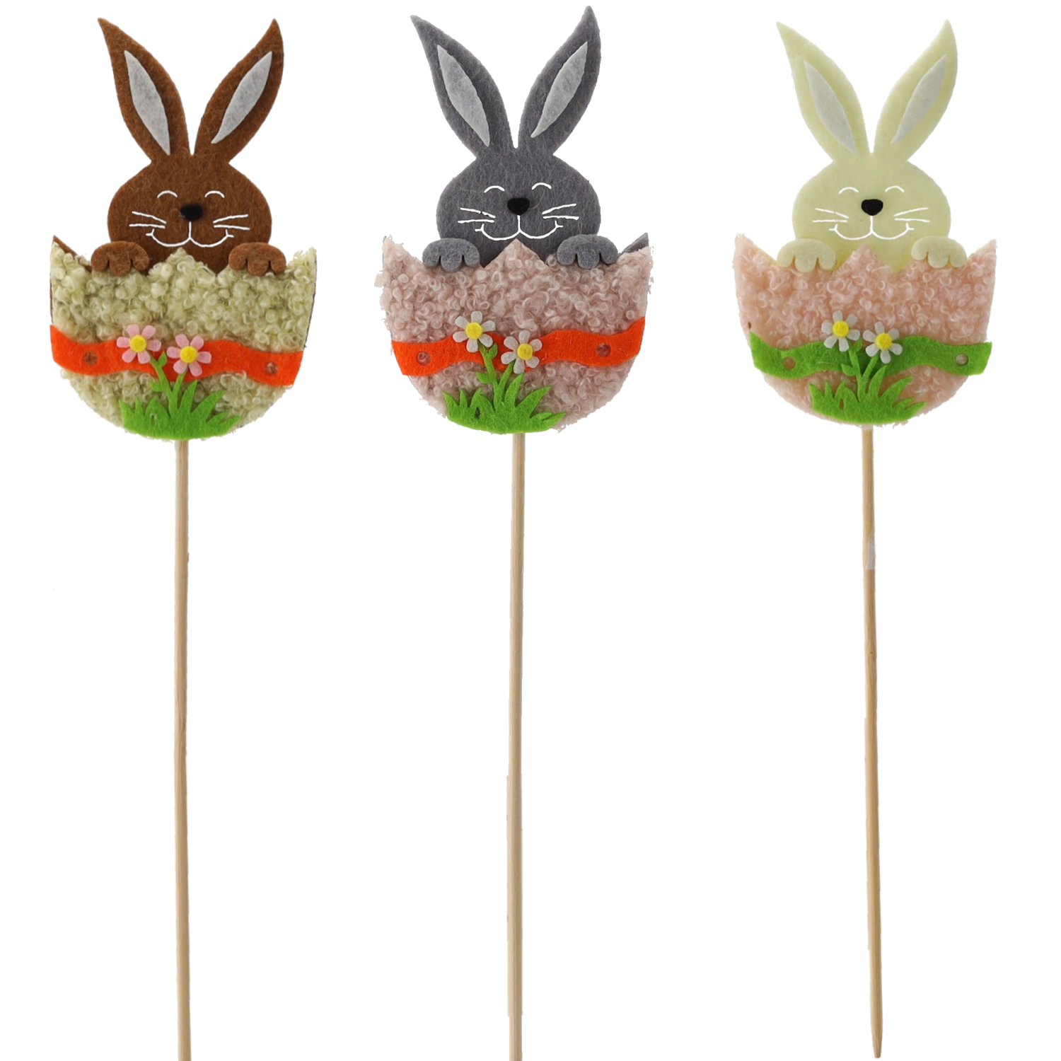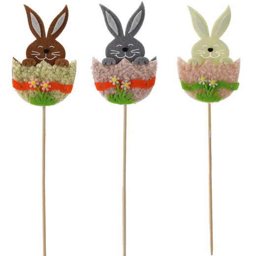 Créez une ambiance festive chez vous avec le lapin dans une coquille sur pique en bois. La décoration est légère, stable et tient parfaitement dans le substrat comme dans la mousse florale. L’assortiment de trois couleurs permet des combinaisons créatives dans les compositions printanières et pascales.