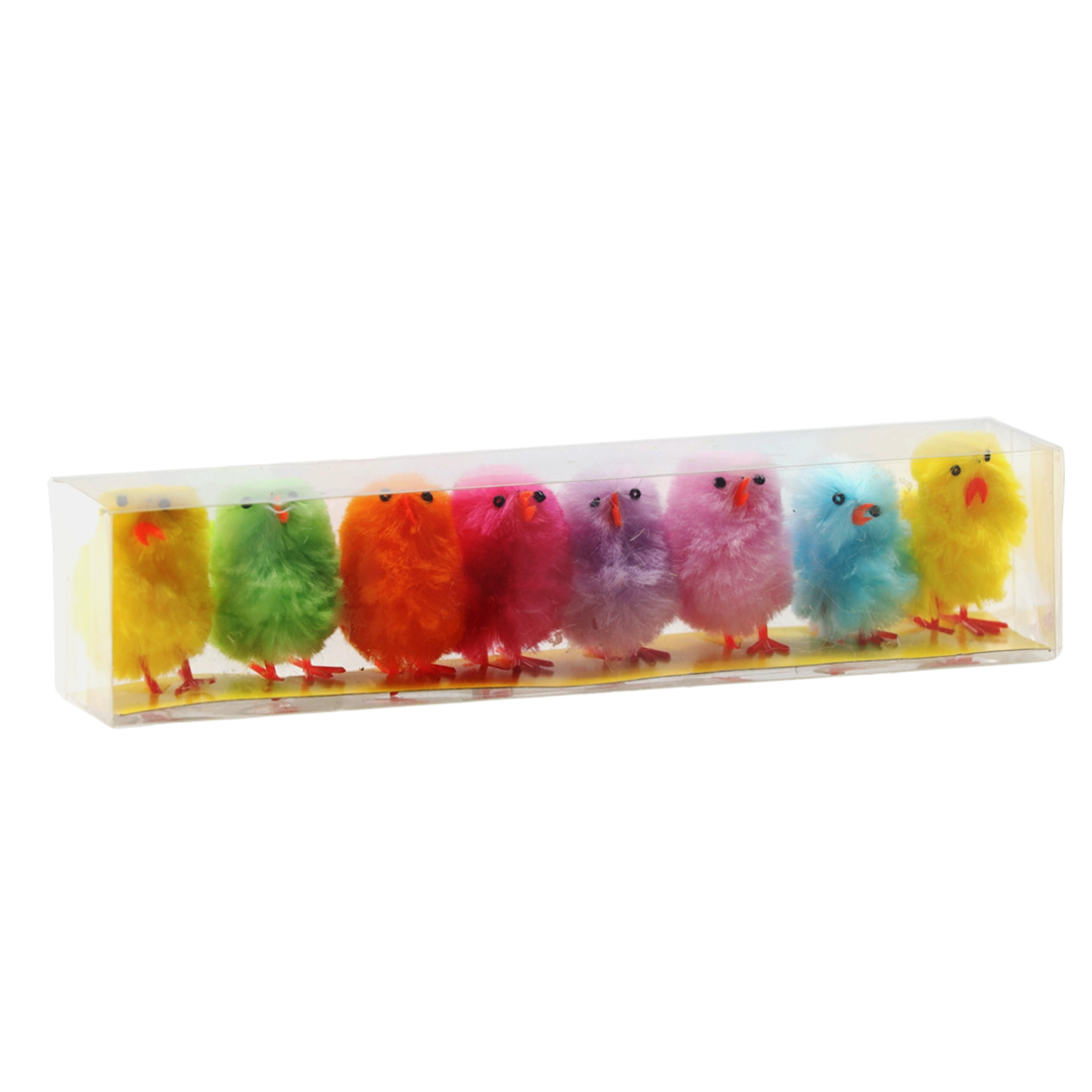 Apportez une touche ludique à votre déco de Pâques avec ce set de huit poussins colorés. Chaque pièce possède un léger duvet, un petit bec et des pattes orange assurant une bonne stabilité. Parfaits pour les tables, étagères et décorations printanières.