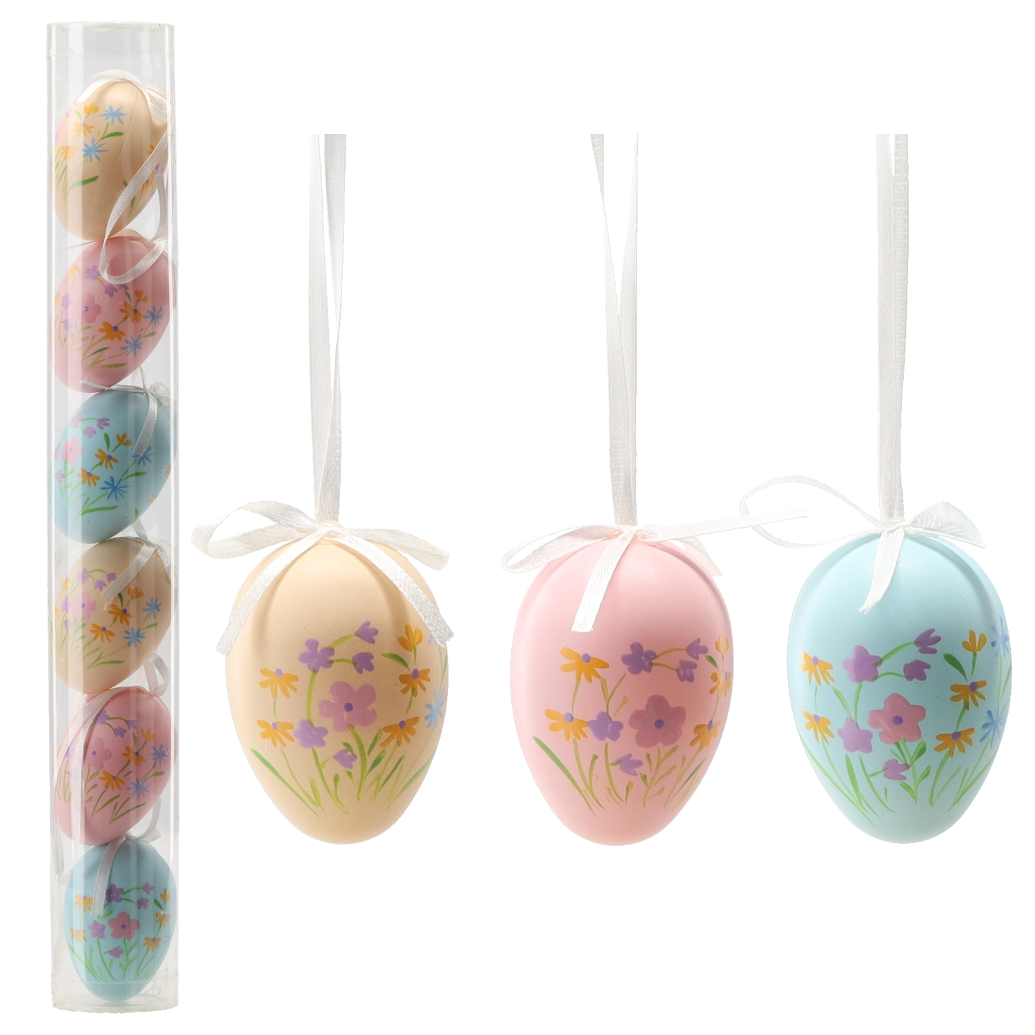 Un lot élégant de six œufs de Pâques de 6 cm avec de délicats motifs floraux dans des couleurs pastel apporte fraîcheur et atmosphère joyeuse à la maison. Les œufs, en plastique léger et résistant, disposent d’une boucle pratique pour les suspendre et sont fournis dans un tube transparent pour un rangement facile. Idéal pour décorer des branches, des guirlandes et des compositions printanières. Motifs floraux pastel, plastique résistant, boucle de suspension, emballage en tube.