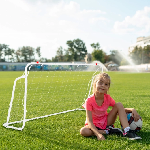 L’installation prend seulement quelques minutes : montage et démontage faciles, filet fixé à l’aide de clips solides, et le colis comprend également des piquets pour l’ancrage au sol. La structure résiste à la déformation et aux intempéries ; pas besoin de démonter le but en cas de météo changeante.