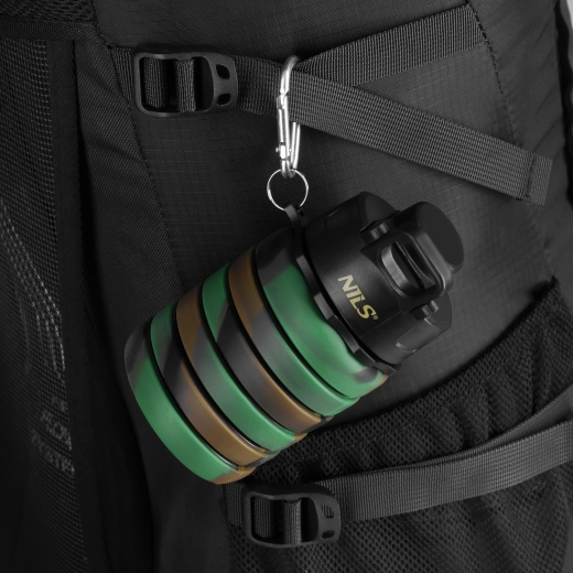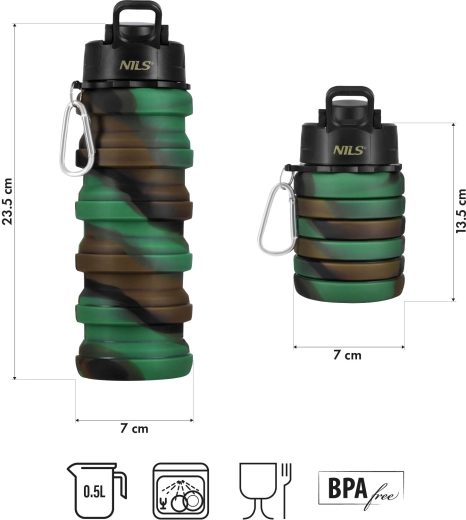 La bouteille pliable en silicone NILS Camp 500 ml est conçue pour un gain de place maximal et un confort optimal en déplacement. Une fois déployée, elle mesure 23,5 cm, et repliée seulement 13,5 cm – idéale pour le sac à dos, le sac à main et le bagage cabine en avion. Le silicone alimentaire résistant, sans BPA et certifié LFGB, garantit un contact sûr avec les boissons sans arrière-goûts indésirables ni libération de substances nocives.