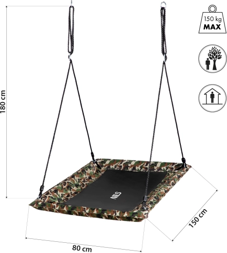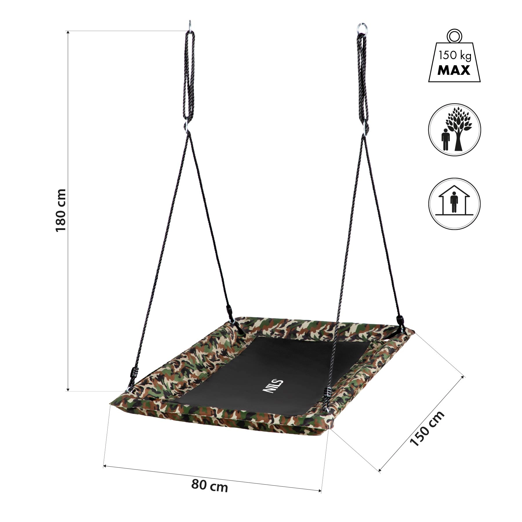 Grâce à sa forme rectangulaire 150 × 80 cm, vous obtenez plus de surface utile qu’avec les modèles ronds classiques. La balançoire est confortable pour une ou deux personnes – idéale pour des frères et sœurs ou des moments partagés parent-enfant. Des cordes réglables jusqu’à 180 cm facilitent l’installation sur une structure, une poutre ou une branche.