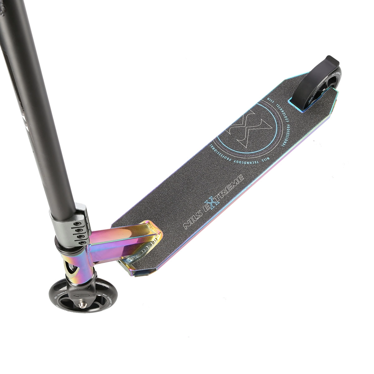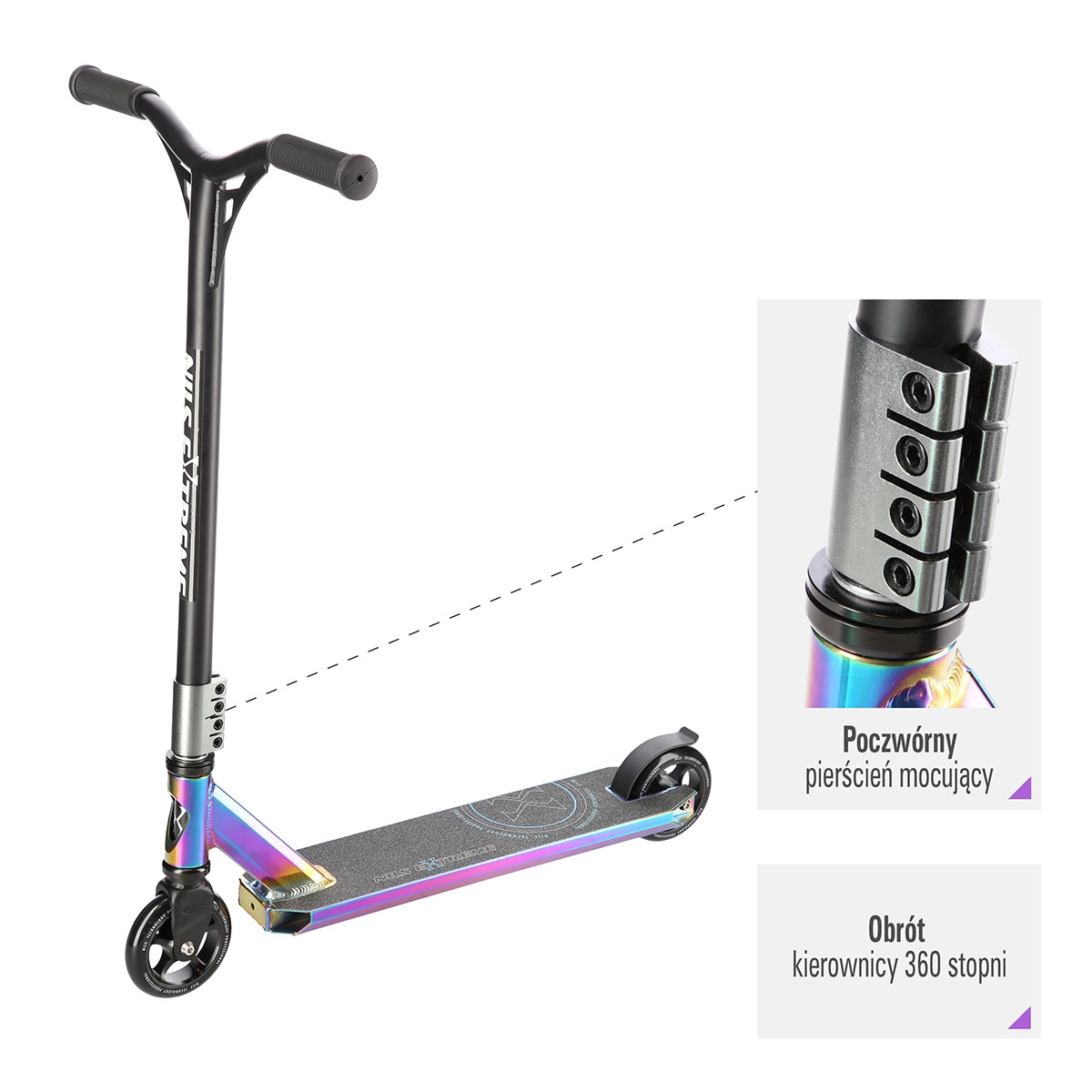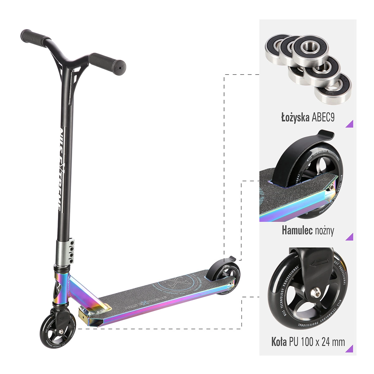 Les petites roues PU 100 × 24 mm avec roulements précis ABEC 9 offrent une accélération vive et une conduite fluide. Le guidon à rotation 360° permet des combinaisons de figures illimitées, tandis que le frein arrière à pression (type garde-boue) assure un freinage sûr et rapide.