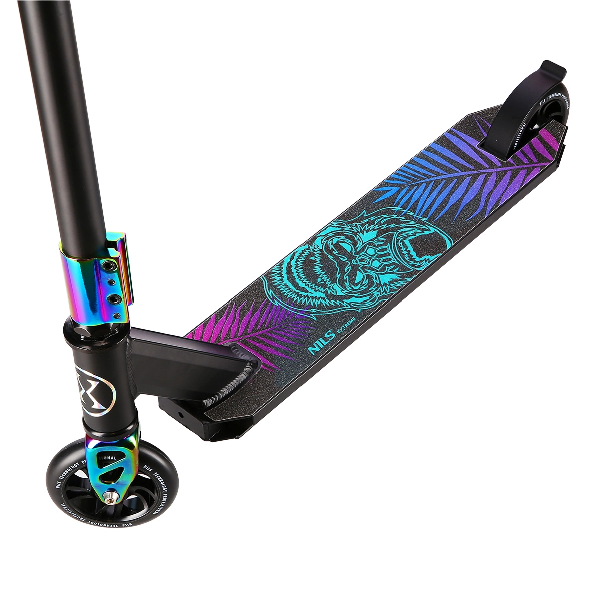 NILS Extreme Neo est une trottinette freestyle fiable pour enfants, ados et adultes, construite sur un cadre en aluminium robuste avec guidon en acier. Grâce au deck à 3 chambres et au collier de serrage à quatre vis, elle maîtrise les figures exigeantes comme les trajets quotidiens sur asphalte et pistes urbaines stabilisées.