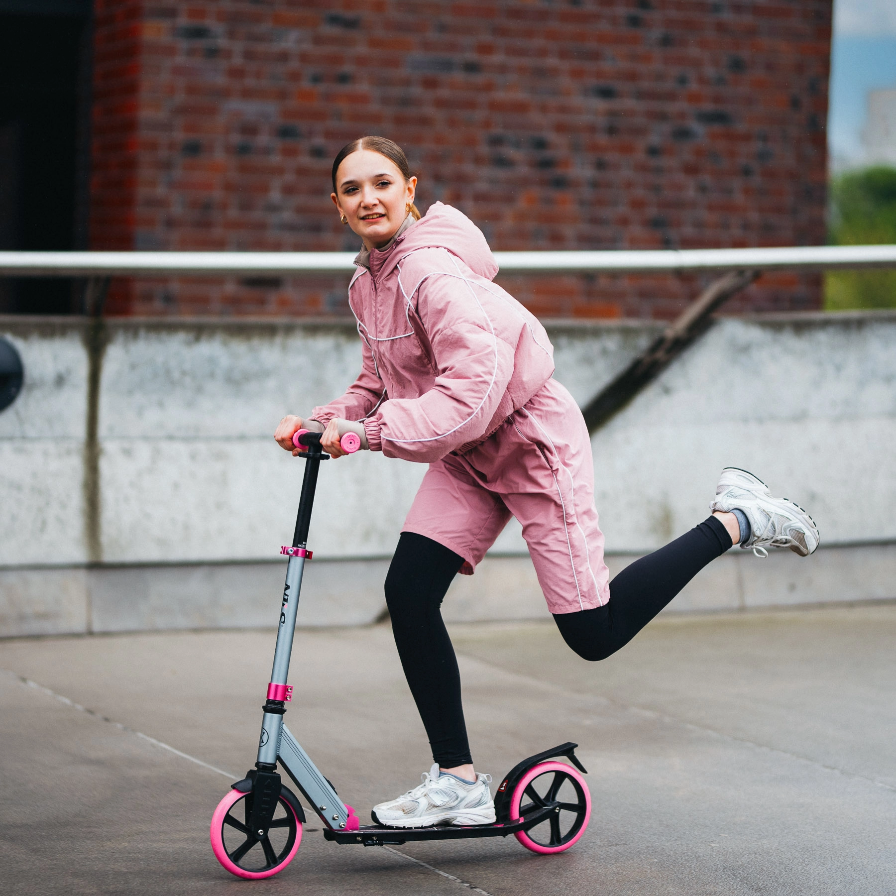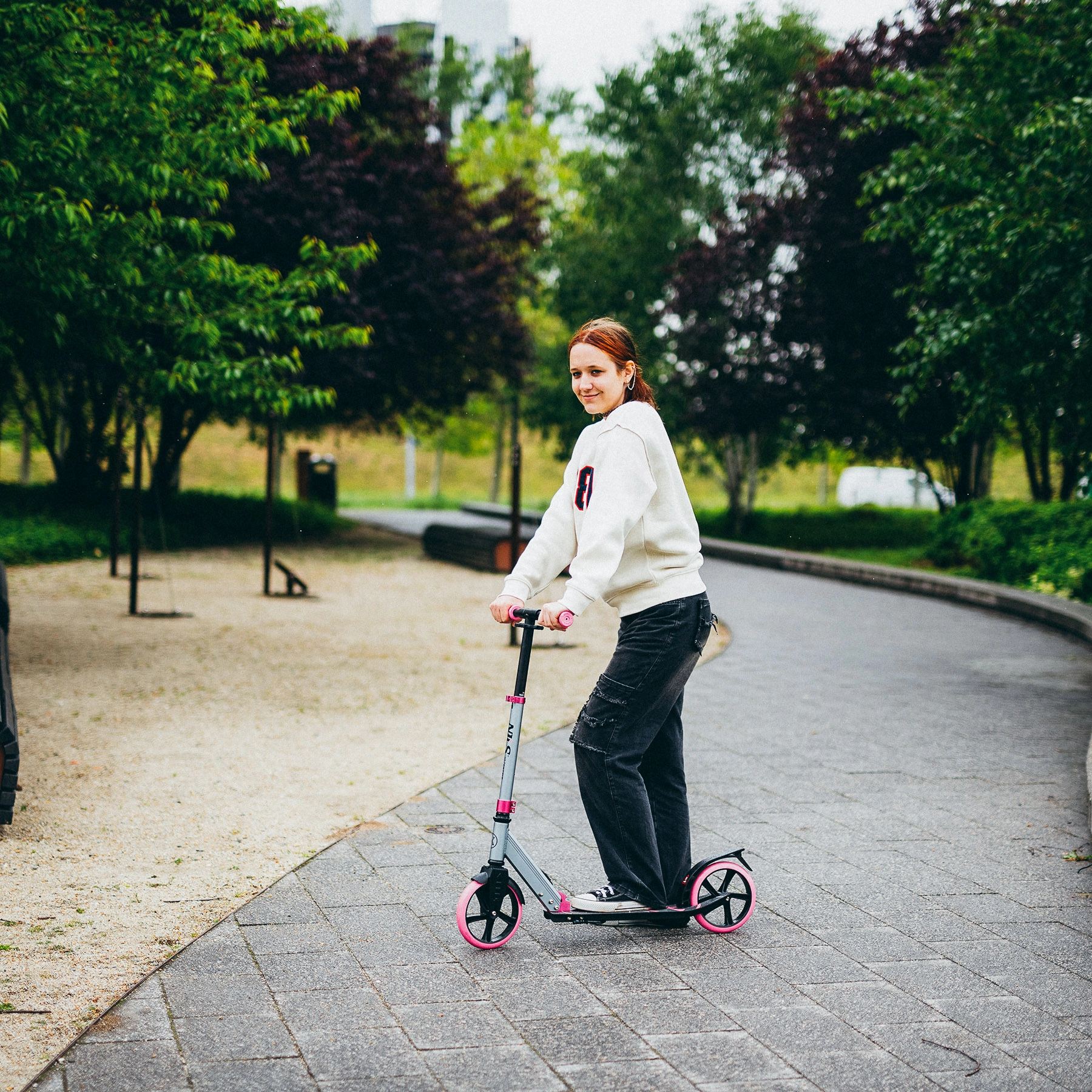 Les grandes roues PU de 200 mm combinées à des roulements ABEC 7 offrent une conduite douce et silencieuse sur l’asphalte et les trottoirs stabilisés. Les grips ergonomiques en TPR, la hauteur de guidon réglable (79–93 cm) et le plateau bas améliorent la stabilité et le confort, tandis que le frein arrière à pied assure un arrêt fiable.