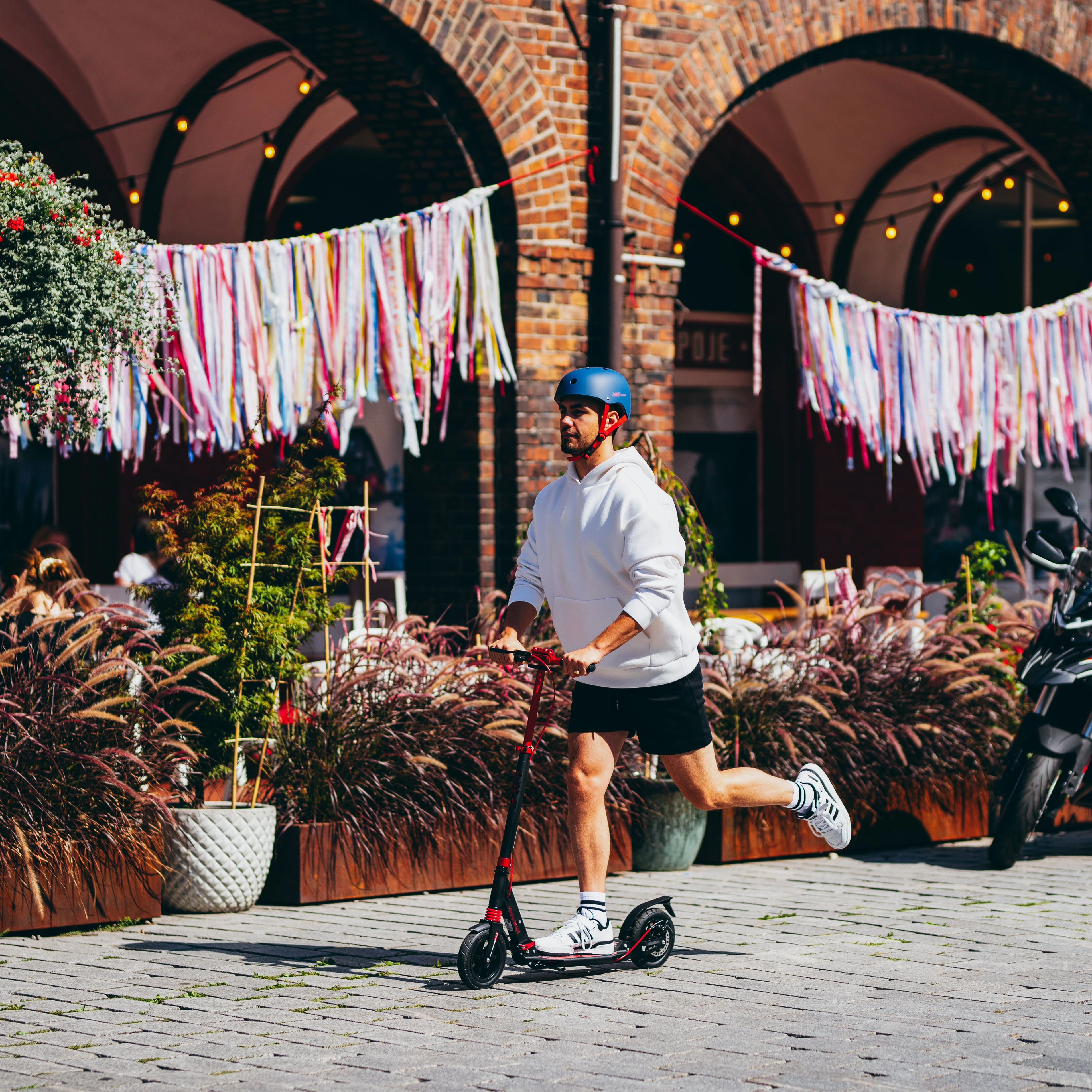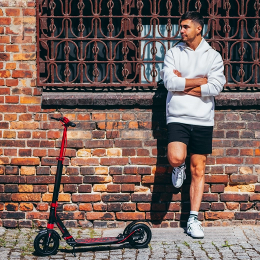 Pour une sécurité maximale, la roue arrière est équipée d’un frein à disque ainsi que d’un frein à pied avec catadioptre intégré pour une meilleure visibilité au crépuscule. La hauteur du guidon réglable et les poignées ergonomiques en caoutchouc assurent une prise en main confortable même sur les longues distances. La trottinette se plie facilement dans des dimensions compactes et, grâce à la sangle d’épaule amovible, se transporte aisément dans les transports, en voiture ou se range à la maison.
