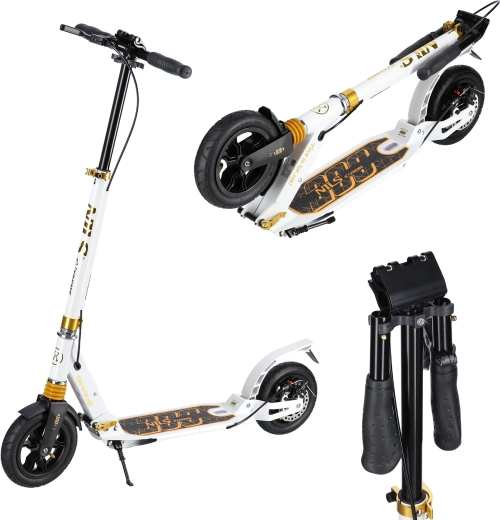 Votre sécurité est renforcée par un frein arrière à disque et un frein à pied ainsi que des réflecteurs pour une meilleure visibilité. Le guidon réglable (89–104 cm) et les poignées ergonomiques en caoutchouc offrent du confort aux utilisateurs de différentes tailles. Grâce à son mécanisme de pliage rapide, à ses dimensions compactes une fois pliée et à sa sangle d’épaule amovible, le transport et le rangement se font en un instant.